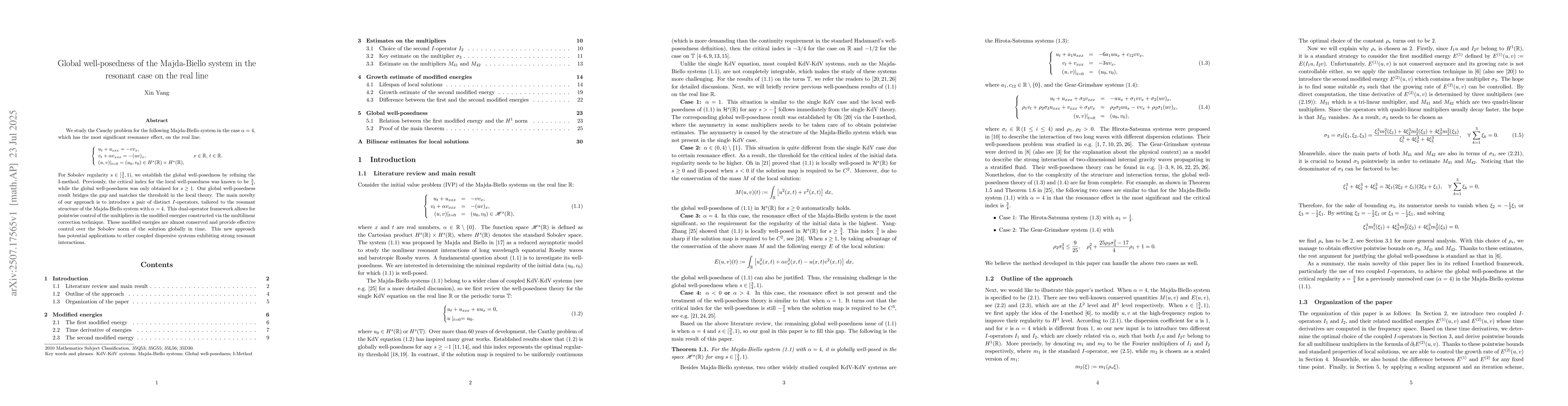 We study the Cauchy problem for the following Majda-Biello system in the case $\alpha=4$, which has the most significant resonance effect, on the real line. \[ \left\{ \begin{array}{l} u_{t} + u_{xxx} = - v v_x, v_{t} + \alpha v_{xxx} = - (uv)_{x}, (u,v)|_{t=0} = (u_0,v_0) \in H^{s}(\mathbb{R}) \times H^{s}(\mathbb{R}), \end{array} \right. \quad x \in \mathbb{R}, \, t \in \mathbb{R}. \] For Sobolev regularity $s\in[\frac34, 1)$, we establish the global well-posedness by refining the I-method. Previously, the critical index for the local well-posedness was known to be $\frac34$, while the global well-posedness was only obtained for $s\geq 1$. Our global well-posedness result bridges the gap and matches the threshold in the local theory. The main novelty of our approach is to introduce a pair of distinct $I$-operators, tailored to the resonant structure of the Majda-Biello system with $\alpha=4$. This dual-operator framework allows for pointwise control of the multipliers in the modified energies constructed via the multilinear correction technique. These modified energies are almost conserved and provide effective control over the Sobolev norm of the solution globally in time. This new approach has potential applications to other coupled dispersive systems exhibiting strong resonant interactions.