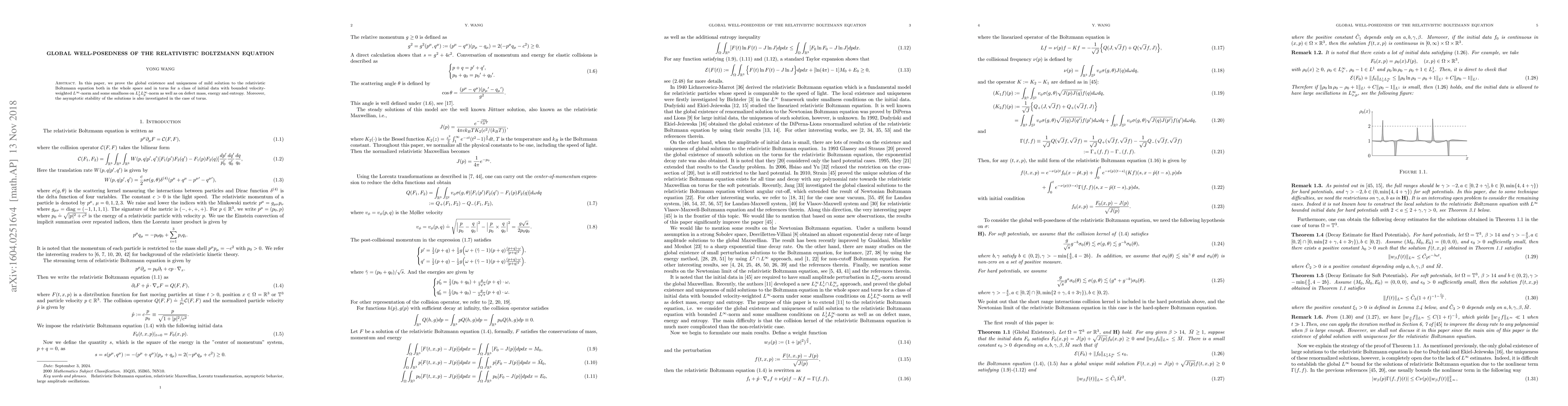 This research proves the global existence and uniqueness of solutions for the relativistic Boltzmann equation in both whole space and torus under specific initial condition constraints. It also explores the asymptotic stability of these solutions for the torus case.