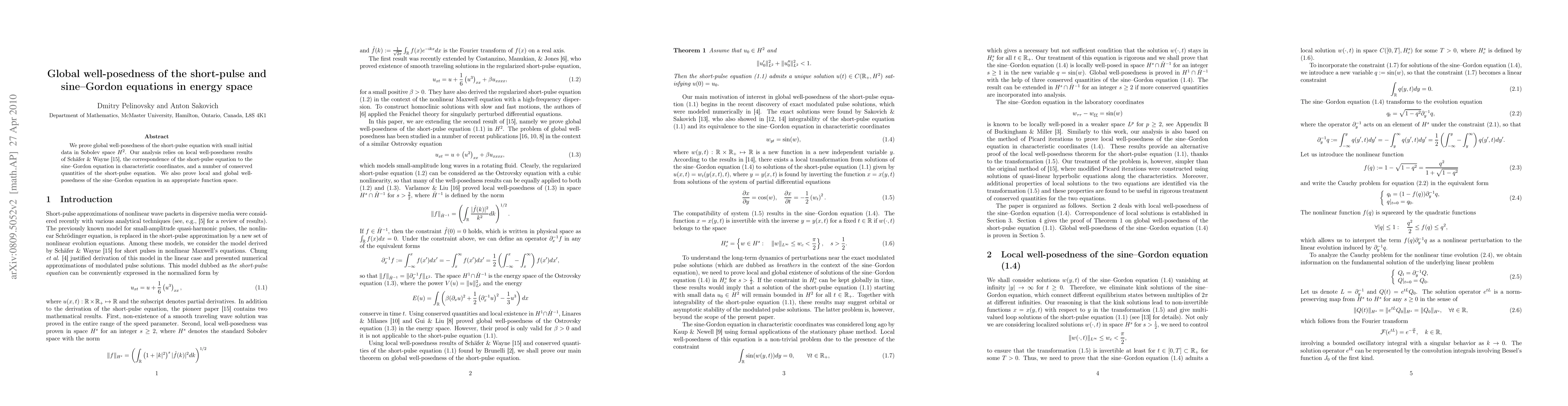 This paper establishes global well-posedness for the short-pulse equation with small initial data in $H^2$ Sobolev space, leveraging local well-posedness results and the relationship between the short-pulse and sine-Gordon equations. It also proves local and global well-posedness for the sine-Gordon equation in a suitable function space.