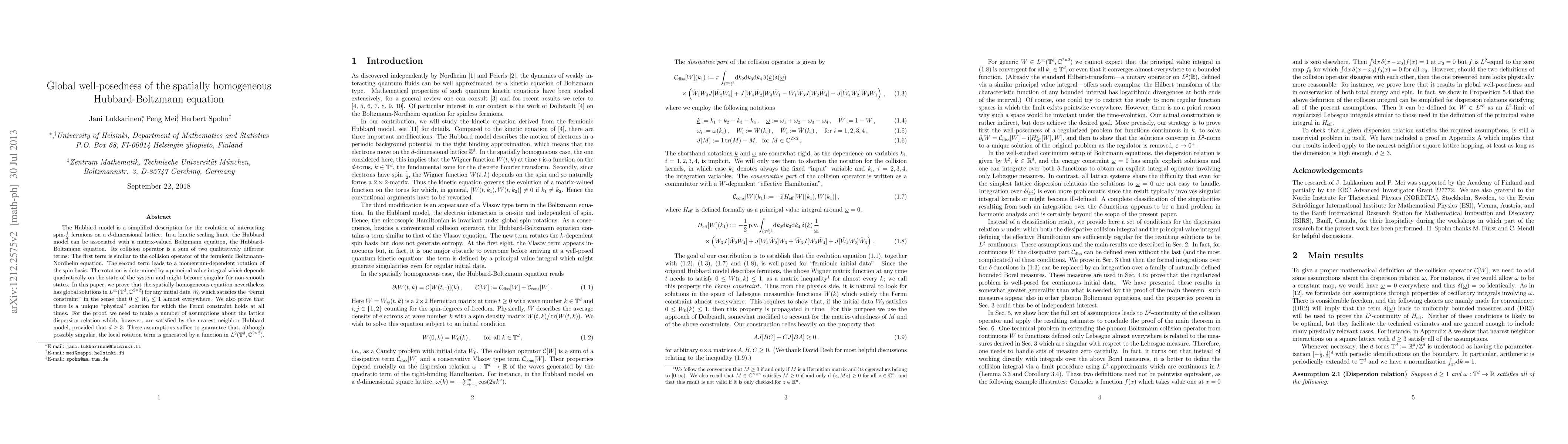 This paper proves global well-posedness for the spatially homogeneous Hubbard-Boltzmann equation, demonstrating existence and uniqueness of solutions in L^\infty(T^d,C^{2x2}) for initial data satisfying the Fermi constraint. The proof handles the singularity potential of the momentum-dependent rotation term through assumptions on the lattice dispersion relation.