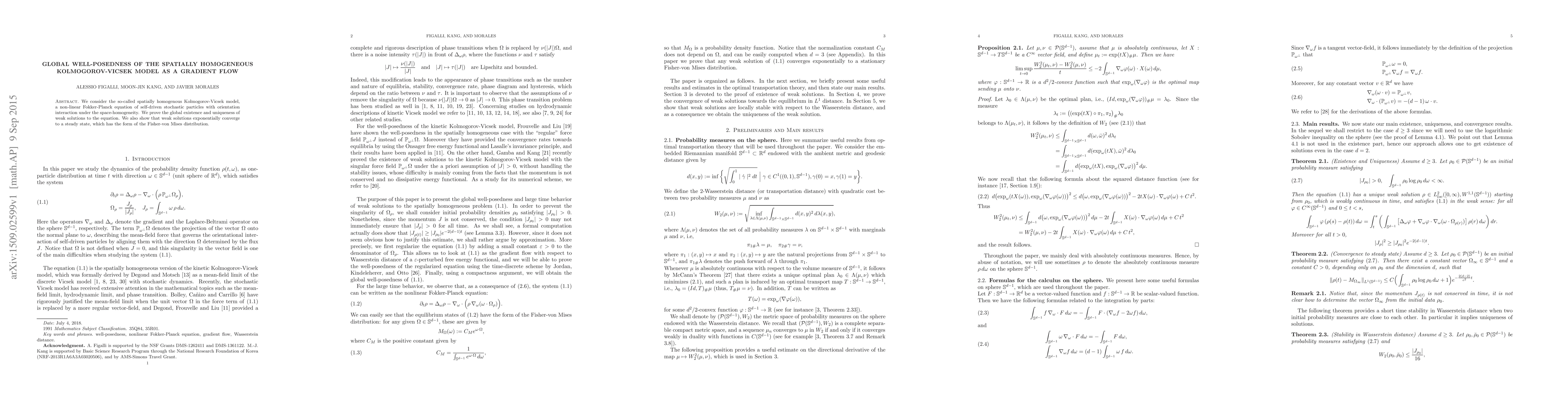 We consider the so-called spatially homogenous Kolmogorov-Vicsek model, a non-linear Fokker-Planck equation of self-driven stochastic particles with orientation interaction under the space-homogeneity. We prove the global existence and uniqueness of weak solutions to the equation. We also show that weak solutions exponentially converge to a steady state, which has the form of the Fisher-von Mises distribution.