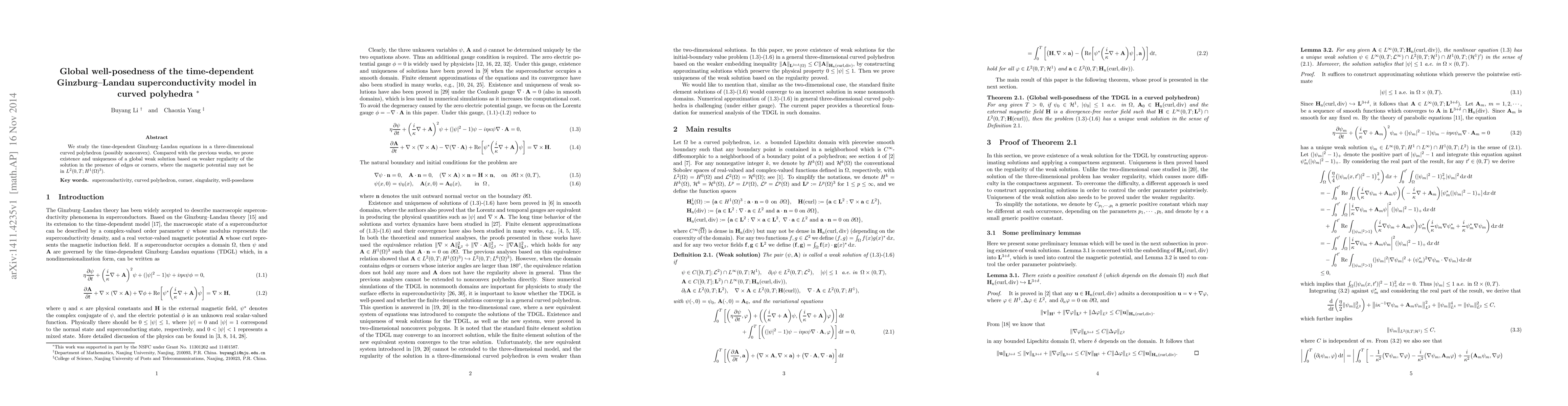 This paper proves the global well-posedness of the time-dependent Ginzburg-Landau superconductivity model in curved polyhedra, establishing existence and uniqueness of a global weak solution under weaker regularity conditions, particularly accommodating edges or corners.