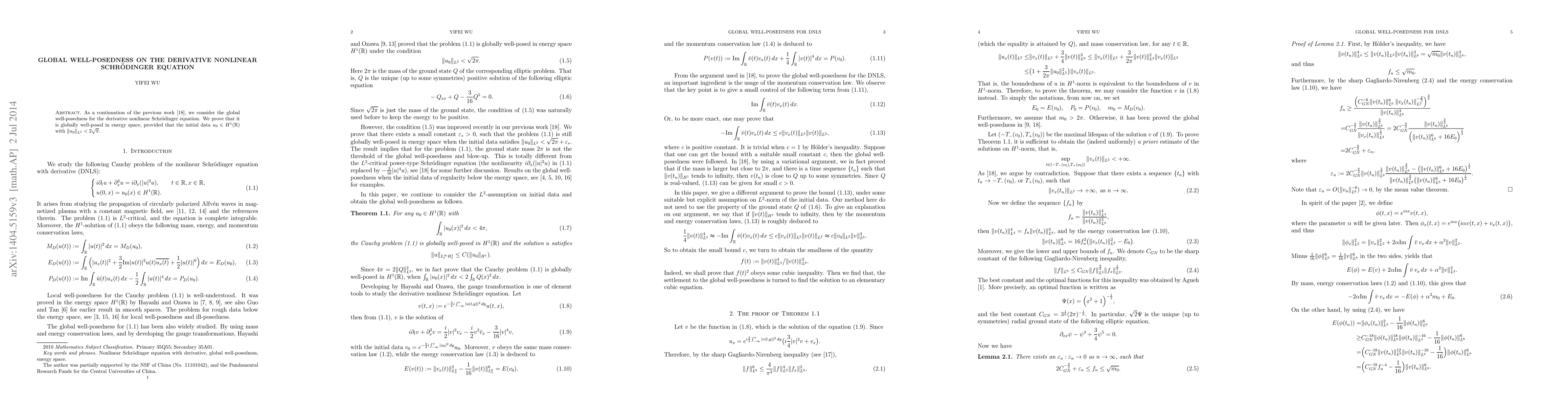 The research revisits the global well-posedness of the derivative nonlinear Schrödinger (DNLS) equation, employing a different argument to prove the bound on a crucial term, without relying on the ground state property of (1.6).