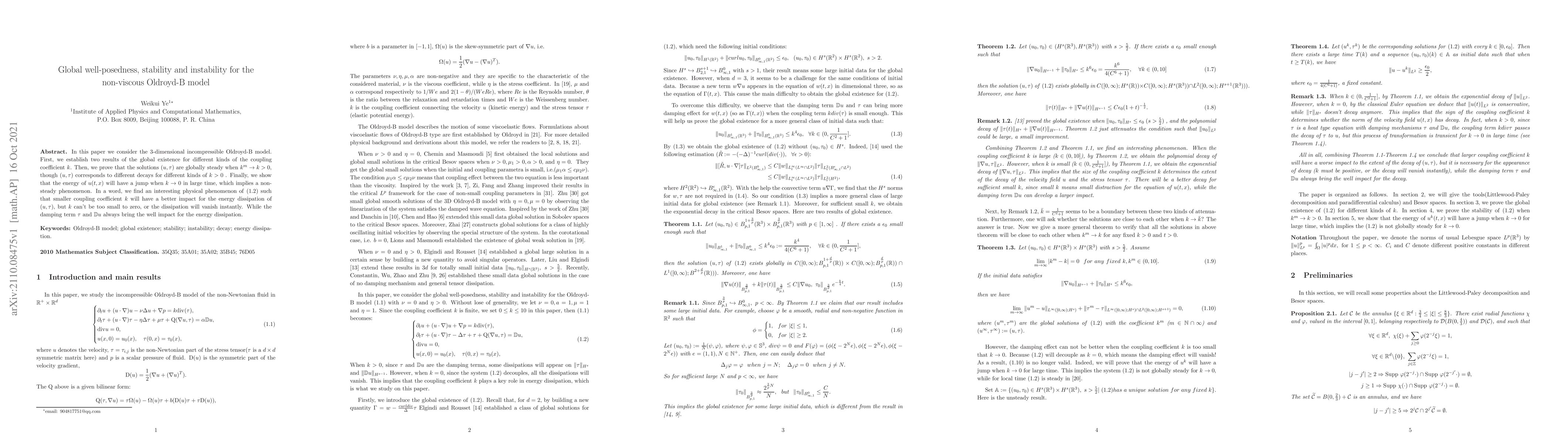 In this paper we consider the 3-dimensional incompressible Oldroyd-B model. First, we establish two results of the global existence for different kinds of the coupling coefficient $k$. Then, we prove that the solutions $(u,\tau)$ are globally steady when $k^m\rightarrow k>0$, though $(u,\tau)$ corresponds to different decays for different kinds of $k>0~$. Finally, we show that the energy of $u(t,x)$ will have a jump when $k\rightarrow 0$ in large time, which implies a non-steady phenomenon. In a word, we find an interesting physical phenomenon of \eqref{1} such that smaller coupling coefficient $k$ will have a better impact for the energy dissipation of $(u,\tau)$, but $k$ can't be too small to zero, or the dissipation will vanish instantly. While the damping term $\tau$ and $\mathbb{D}u$ always bring the well impact for the energy dissipation.