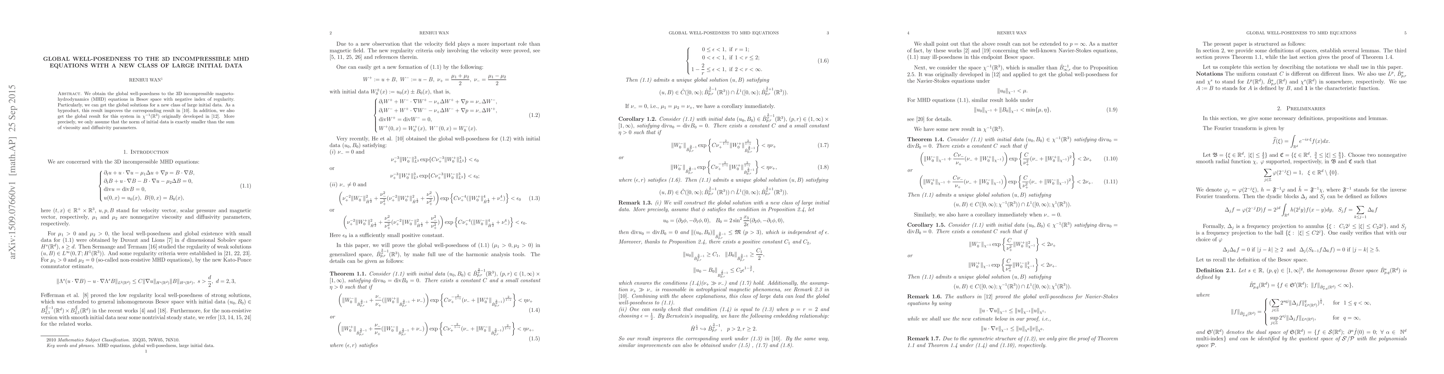 This paper establishes global well-posedness for the 3D incompressible MHD equations in Besov space with negative regularity, extending solutions to a new class of large initial data. It also improves upon previous results and extends the global result to $\mathcal{\chi}^{-1}(\R^3)$ space with minimal initial data norm constraints.