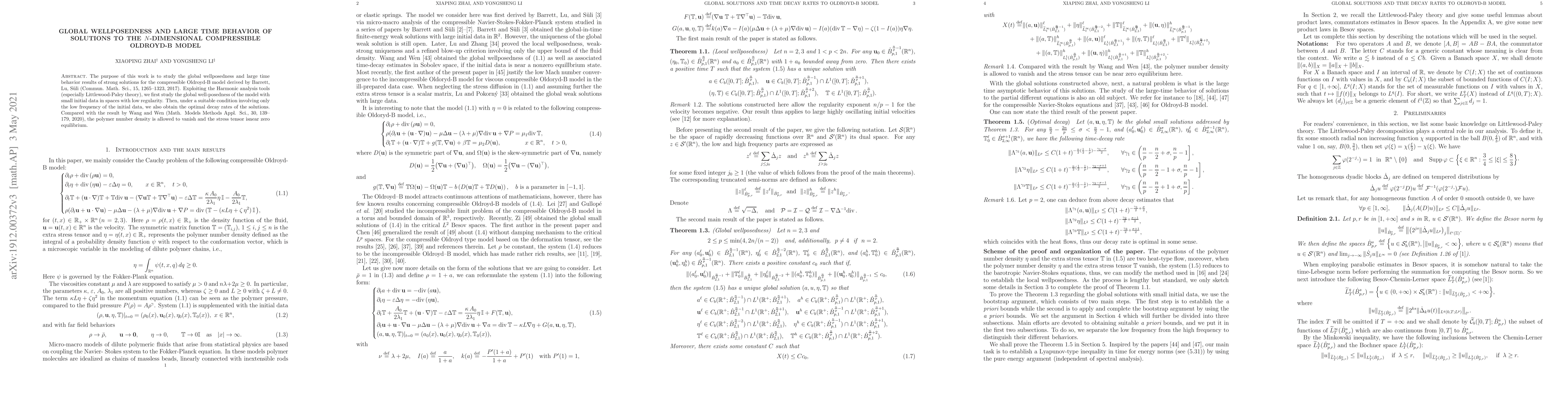 This paper investigates global wellposedness and large time behavior of solutions for the compressible Oldroyd-B model, utilizing harmonic analysis tools. The study establishes global wellposedness for small initial data in low regularity spaces and derives optimal decay rates under specific low-frequency conditions.