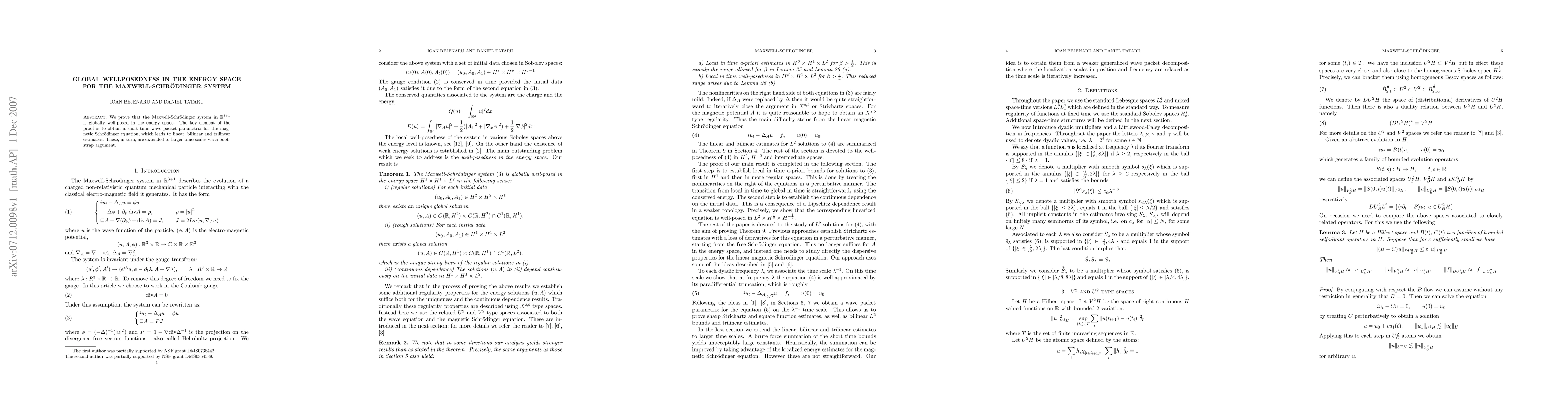 This paper proves global well-posedness in the energy space for the Maxwell-Schr\"odinger system in $\R^{3+1}$ by establishing a short time wave packet parametrix for the magnetic Schr\"odinger equation, leading to linear, bilinear, and trilinear estimates, which are then extended via a bootstrap argument.