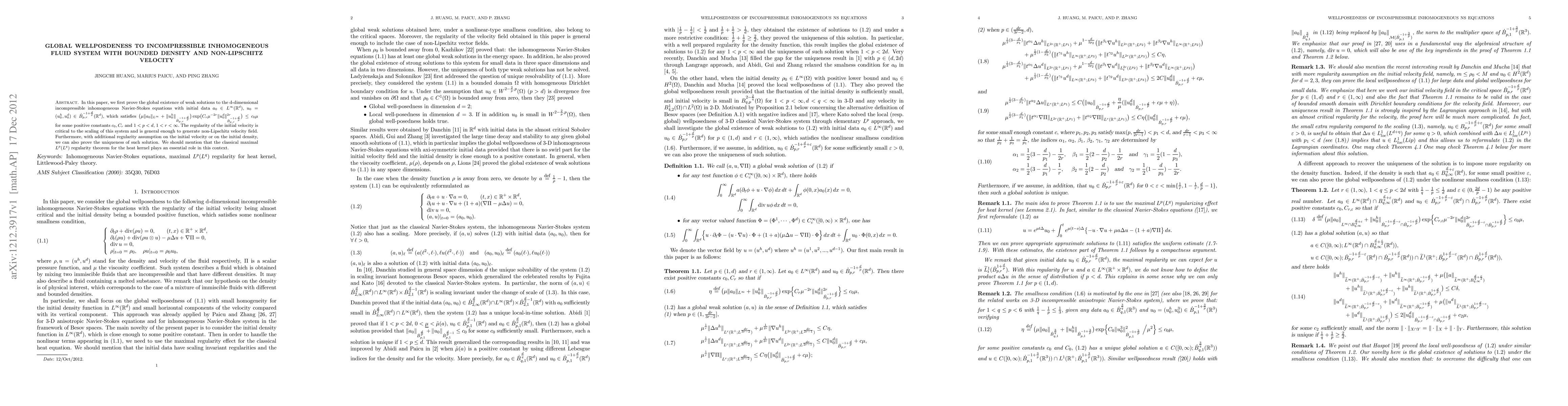 In this paper, we first prove the global existence of weak solutions to the d-dimensional incompressible inhomogeneous Navier-Stokes equations with initial data in critical Besov spaces, which satisfies a non-linear smallness condition. The regularity of the initial velocity is critical to the scaling of this system and is general enough to generate non-Lipschitz velocity field. Furthermore, with additional regularity assumption on the initial velocity or on the initial density, we can also prove the uniqueness of such solution. We should mention that the classical maximal regularity theorem for the heat kernel plays an essential role in this context.