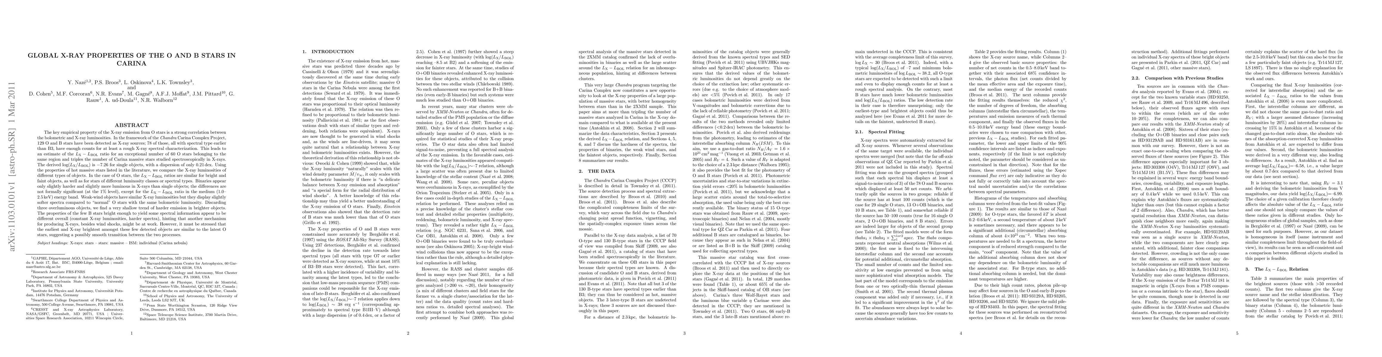 The key empirical property of the X-ray emission from O stars is a strong correlation between the bolometric and X-ray luminosities. In the framework of the Chandra Carina Complex Project, 129 O and B stars have been detected as X-ray sources; 78 of those, all with spectral type earlier than B3, have enough counts for at least a rough X-ray spectral characterization. This leads to an estimate of the Lx/Lbol ratio for an exceptional number of 60 O stars belonging to the same region and triples the number of Carina massive stars studied spectroscopically in X-rays. The derived log(Lx/Lbol) is -7.26 for single objects, with a dispersion of only 0.21dex. Using the properties of hot massive stars listed in the literature, we compare the X-ray luminosities of different types of objects. In the case of O stars, the Lx/Lbol ratios are similar for bright and faint objects, as well as for stars of different luminosity classes or spectral types. Binaries appear only slightly harder and slightly more luminous in X-rays than single objects; the differences are not formally significant (at the 1% level), except for the Lx/Lbol ratio in the medium (1.0--2.5keV) energy band. Weak-wind objects have similar X-ray luminosities but they display slightly softer spectra compared to "normal" O stars with the same bolometric luminosity. Discarding three overluminous objects, we find a very shallow trend of harder emission in brighter objects. The properties of the few B stars bright enough to yield some spectral information appear to be different overall (constant X-ray luminosities, harder spectra), hinting that another mechanism for producing X-rays, besides wind shocks, might be at work. However, it must be stressed that the earliest and X-ray brightest amongst these few detected objects are similar to the latest O stars, suggesting a possibly smooth transition between the two processes.