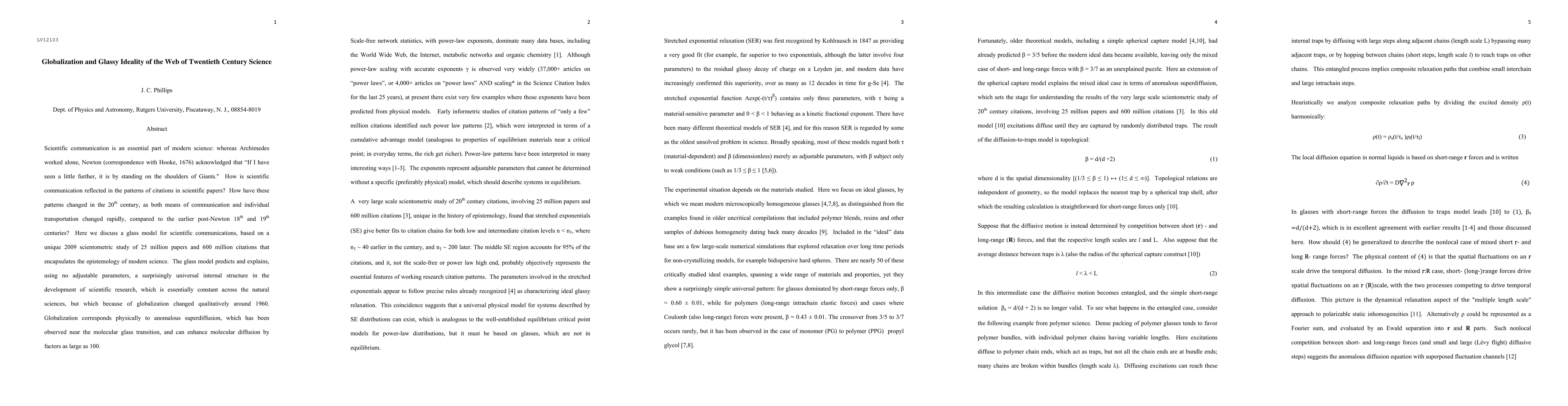 Scientific communication is an essential part of modern science: whereas Archimedes worked alone, Newton (correspondence with Hooke, 1676) acknowledged that "If I have seen a little further, it is by standing on the shoulders of Giants." How is scientific communication reflected in the patterns of citations in scientific papers? How have these patterns changed in the 20th century, as both means of communication and individual transportation changed rapidly, compared to the earlier post-Newton 18th and 19th centuries? Here we discuss a glass model for scientific communications, based on a unique 2009 scientometric study of 25 million papers and 600 million citations that encapsulates the epistemology of modern science. The glass model predicts and explains, using no adjustable parameters, a surprisingly universal internal structure in the development of scientific research, which is essentially constant across the natural sciences, but which because of globalization changed qualitatively around 1960. Globalization corresponds physically to anomalous superdiffusion, which has been observed near the molecular glass transition, and can enhance molecular diffusion by factors as large as 100.