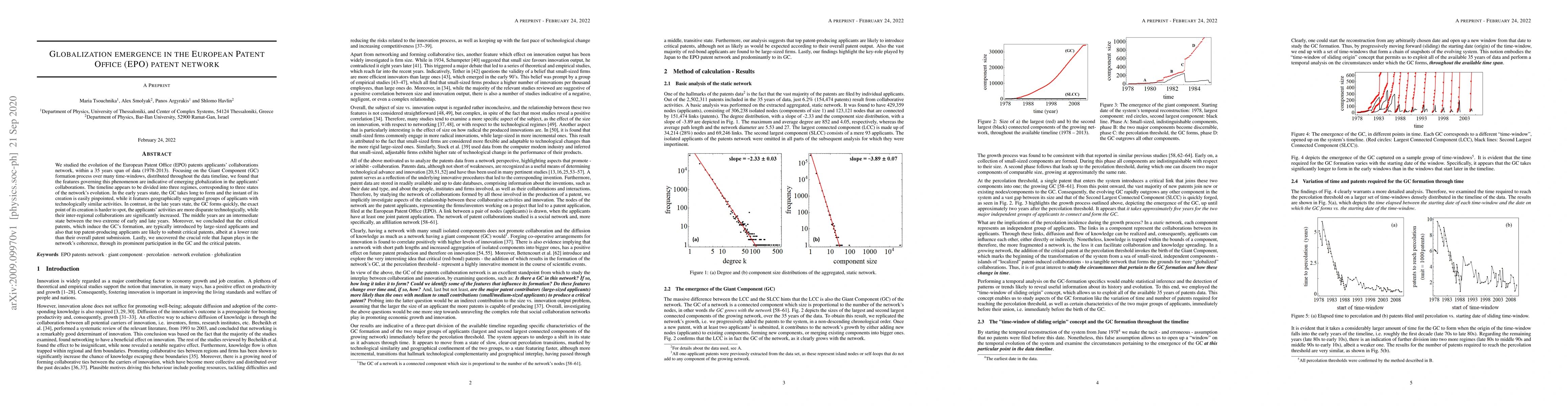 Researchers studied the European Patent Office patent network over 35 years, finding three stages of evolution: early years with geographically segregated groups, middle years with increasing inter-regional collaborations, and late years with disparate activities and rapid GC formation. Japan played a crucial role in network coherence through prominent participation in the Giant Component.