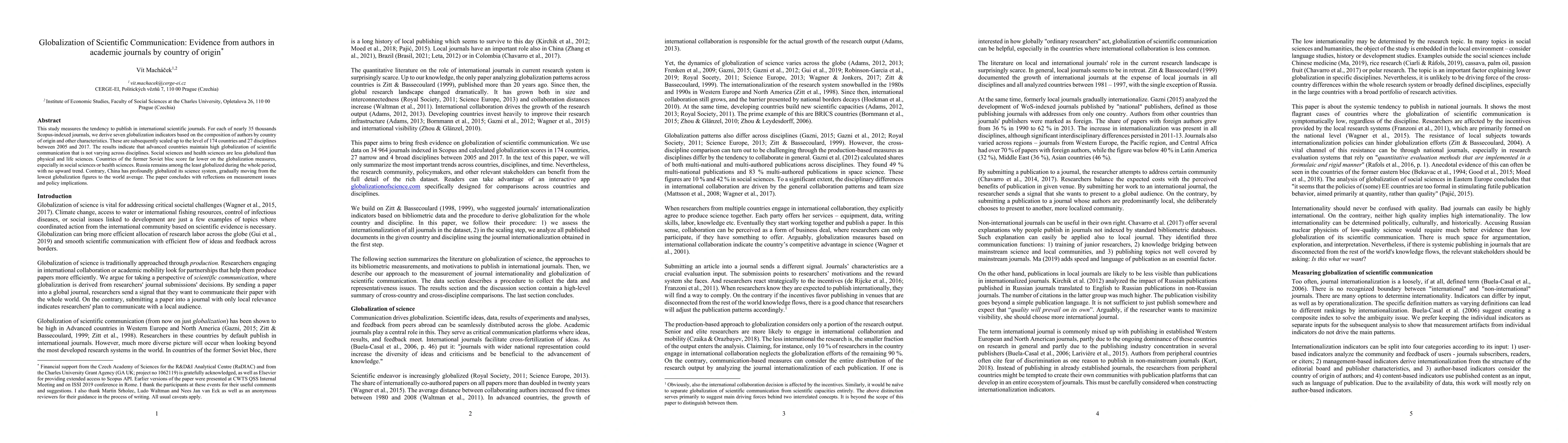 This study analyzes the globalization of scientific communication across 174 countries and 27 disciplines from 2005 to 2017, finding that advanced countries maintain high levels of international publishing, with physical and life sciences being more globalized than social and health sciences. China has significantly increased its global scientific output, while Russia remains among the least globalized.