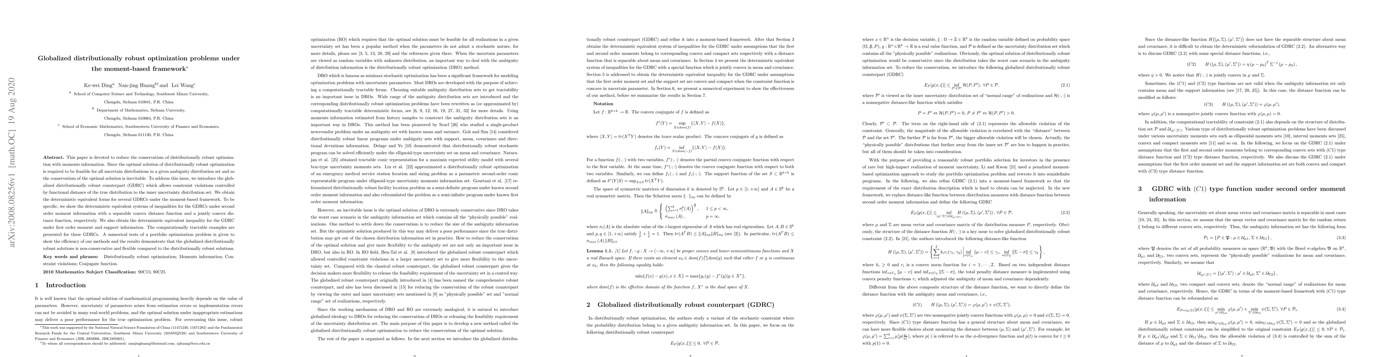 This paper proposes a globalized distributionally robust optimization (GDRC) framework to reduce conservatism by allowing controlled constraint violations based on the true distribution's distance from an uncertainty set. It provides deterministic equivalents for GDRCs under moment-based information and demonstrates their computational efficiency through a portfolio optimization example.