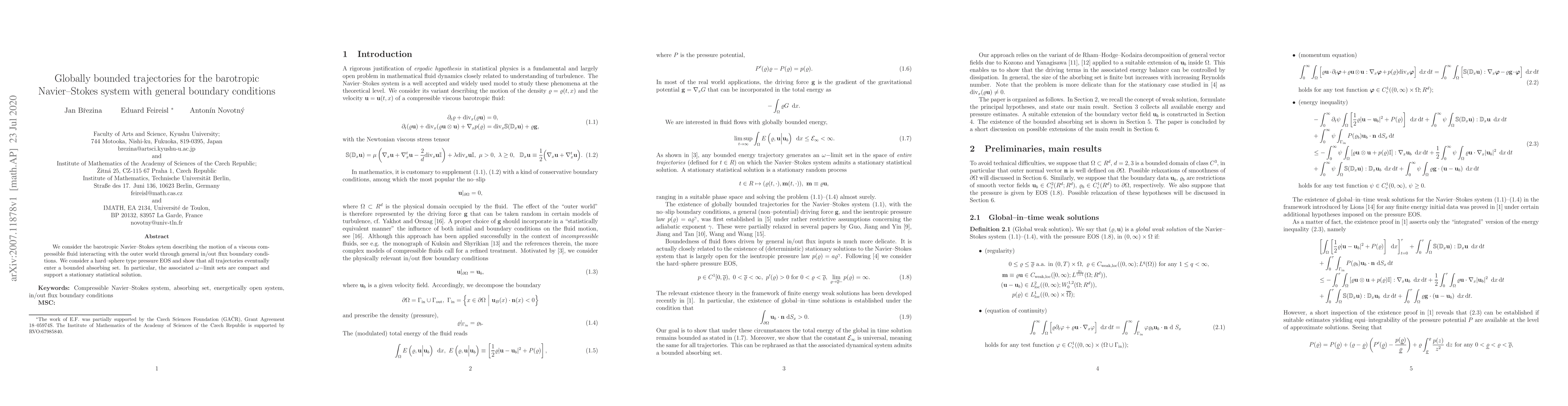 We consider the barotropic Navier--Stokes system describing the motion of a viscous compressible fluid interacting with the outer world through general in/out flux boundary conditions. We consider a hard--sphere type pressure EOS and show that all trajectories eventually enter a bounded absorbing set. In particular, the associated omega-limit sets are compact and support a stationary statistical solution.