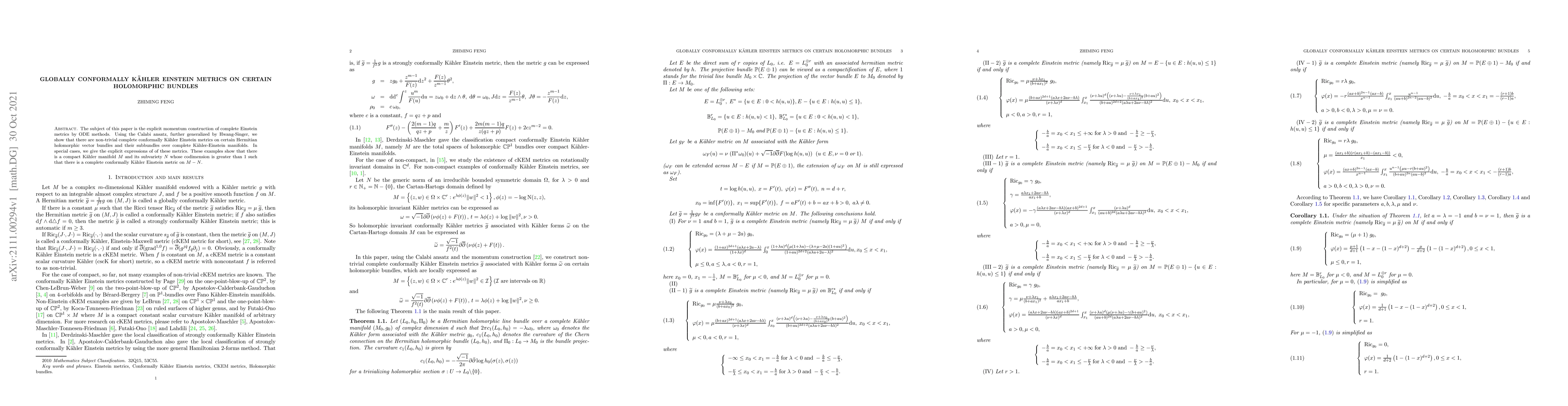 This paper constructs complete Einstein metrics on certain holomorphic vector bundles over Kähler-Einstein manifolds using ODE methods and the generalized Calabi ansatz. It demonstrates the existence of non-trivial complete conformally Kähler Einstein metrics on these bundles and provides explicit expressions in special cases.