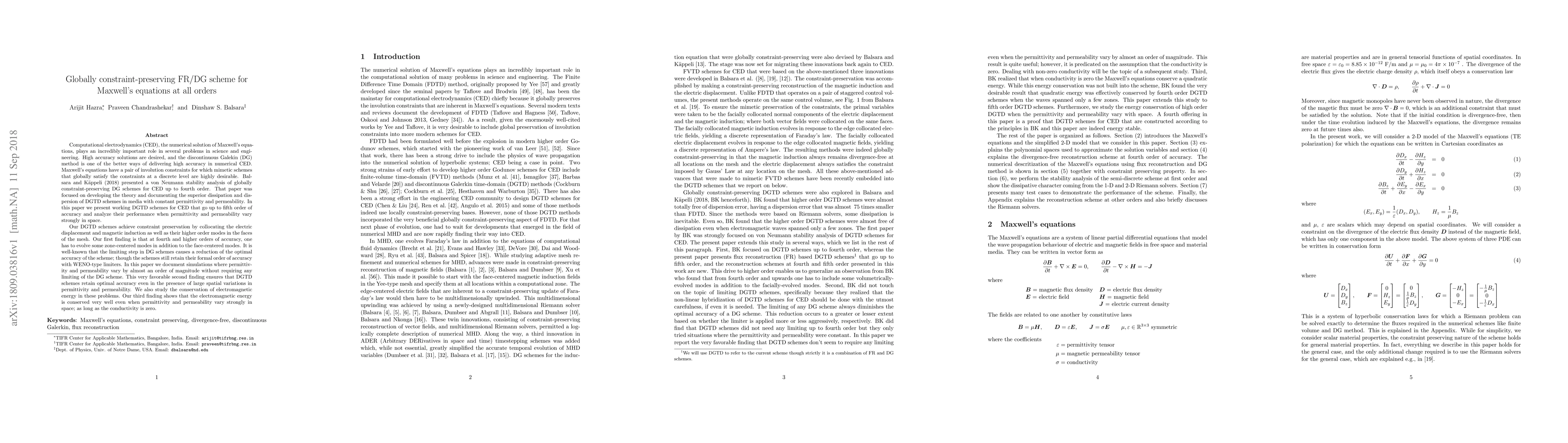 This paper presents a globally constraint-preserving discontinuous Galerkin (DG) method for solving Maxwell's equations at 5th order accuracy. The method maintains optimal accuracy and conserves electromagnetic energy even when permittivity and permeability vary significantly in space.