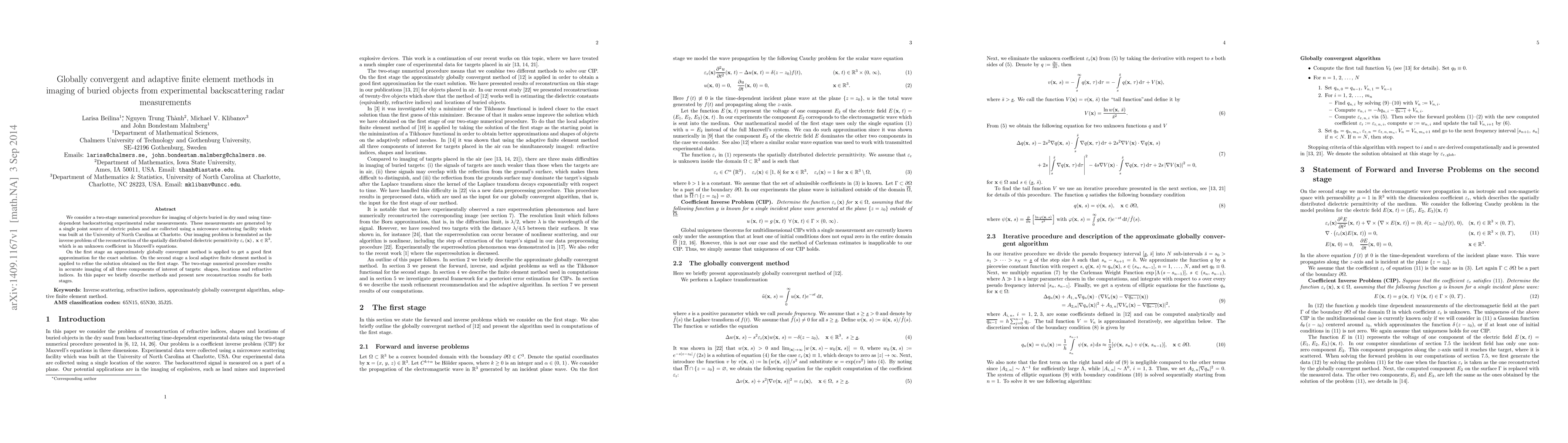 We consider a two-stage numerical procedure for imaging of objects buried in dry sand using time-dependent backscattering experimental radar measurements. These measurements are generated by a single point source of electric pulses and are collected using a microwave scattering facility which was built at the University of North Carolina at Charlotte. Our imaging problem is formulated as the inverse problem of the reconstruction of the spatially distributed dielectric permittivity $\varepsilon_\mathrm{r}\left(\mathbf{x}\right), \ \mathbf{x}\in \mathbb{R}^{3}$, which is an unknown coefficient in Maxwell's equations. On the first stage an approximately globally convergent method is applied to get a good first approximation for the exact solution. On the second stage a local adaptive finite element method is applied to refine the solution obtained on the first stage. The two-stage numerical procedure results in accurate imaging of all three components of interest of targets: shapes, locations and refractive indices. In this paper we briefly describe methods and present new reconstruction results for both stages.
