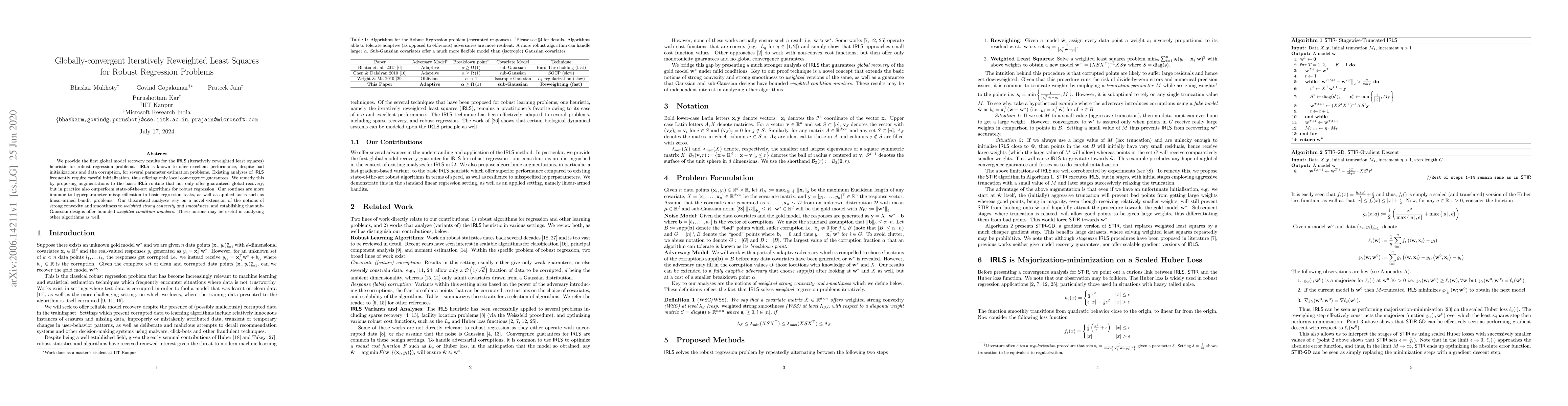We provide the first global model recovery results for the IRLS (iteratively reweighted least squares) heuristic for robust regression problems. IRLS is known to offer excellent performance, despite bad initializations and data corruption, for several parameter estimation problems. Existing analyses of IRLS frequently require careful initialization, thus offering only local convergence guarantees. We remedy this by proposing augmentations to the basic IRLS routine that not only offer guaranteed global recovery, but in practice also outperform state-of-the-art algorithms for robust regression. Our routines are more immune to hyperparameter misspecification in basic regression tasks, as well as applied tasks such as linear-armed bandit problems. Our theoretical analyses rely on a novel extension of the notions of strong convexity and smoothness to weighted strong convexity and smoothness, and establishing that sub-Gaussian designs offer bounded weighted condition numbers. These notions may be useful in analyzing other algorithms as well.