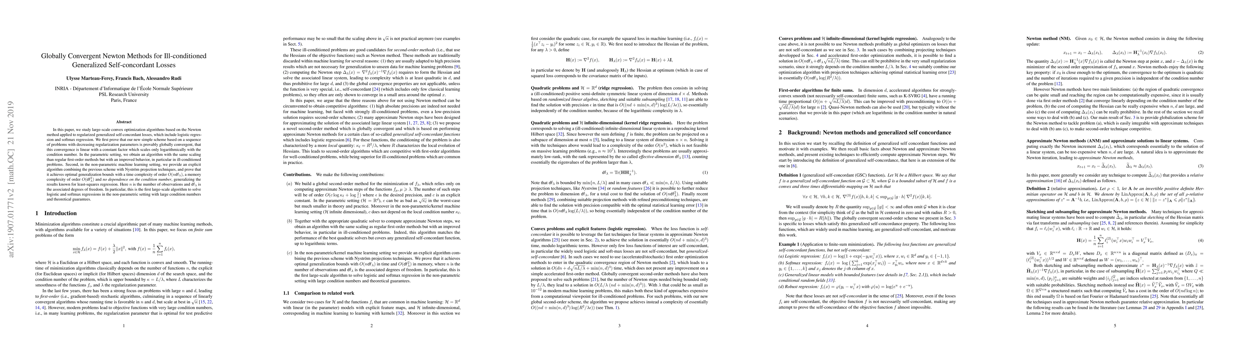 In this paper, we study large-scale convex optimization algorithms based on the Newton method applied to regularized generalized self-concordant losses, which include logistic regression and softmax regression. We first prove that our new simple scheme based on a sequence of problems with decreasing regularization parameters is provably globally convergent, that this convergence is linear with a constant factor which scales only logarithmically with the condition number. In the parametric setting, we obtain an algorithm with the same scaling than regular first-order methods but with an improved behavior, in particular in ill-conditioned problems. Second, in the non parametric machine learning setting, we provide an explicit algorithm combining the previous scheme with Nystr{\"o}m projection techniques, and prove that it achieves optimal generalization bounds with a time complexity of order O(ndf $\lambda$), a memory complexity of order O(df 2 $\lambda$) and no dependence on the condition number, generalizing the results known for least-squares regression. Here n is the number of observations and df $\lambda$ is the associated degrees of freedom. In particular, this is the first large-scale algorithm to solve logistic and softmax regressions in the non-parametric setting with large condition numbers and theoretical guarantees.