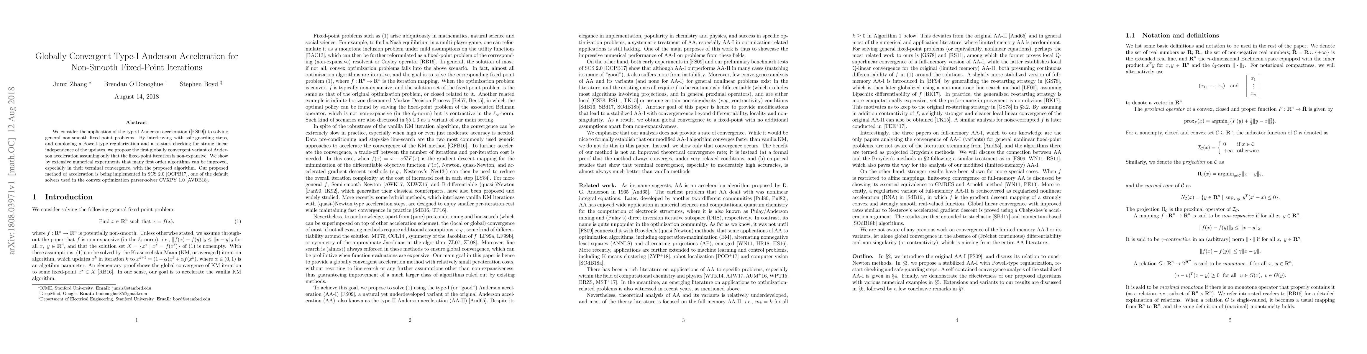 This paper proposes a globally convergent type-I Anderson acceleration method for solving non-smooth fixed-point problems, ensuring convergence even when the iteration is non-expansive. The method incorporates safeguards, Powell-type regularization, and re-start checks to enhance terminal convergence, and is implemented in SCS 2.0 for use in the CVXPY solver.