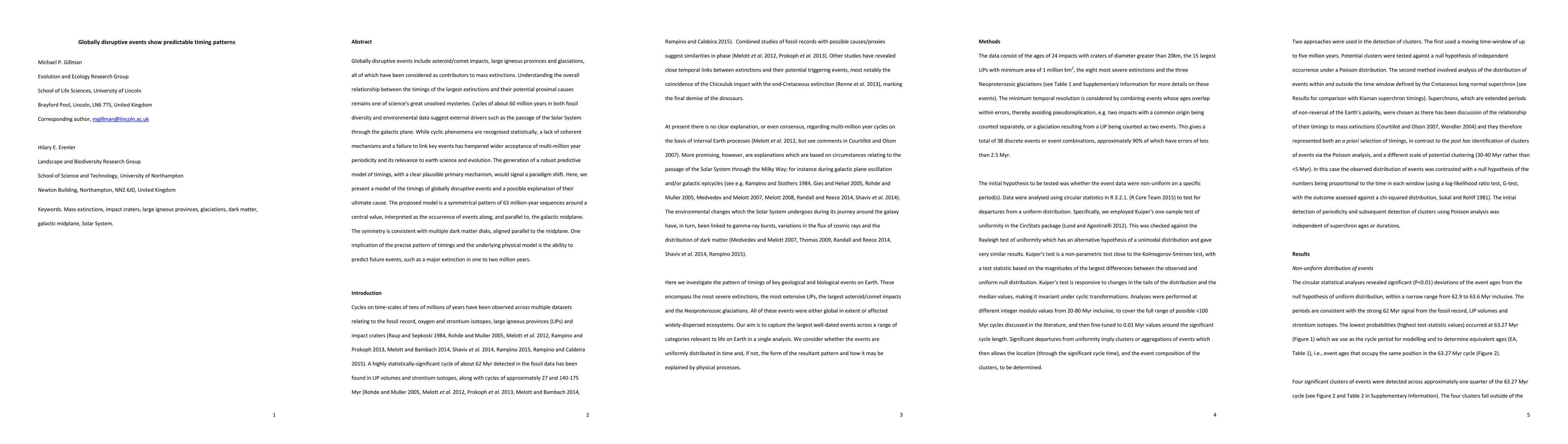 Globally disruptive events include asteroid/comet impacts, large igneous provinces and glaciations, all of which have been considered as contributors to mass extinctions. Understanding the overall relationship between the timings of the largest extinctions and their potential proximal causes remains one of science's great unsolved mysteries. Cycles of about 60 million years in both fossil diversity and environmental data suggest external drivers such as the passage of the Solar System through the galactic plane. While cyclic phenomena are recognised statistically, a lack of coherent mechanisms and a failure to link key events has hampered wider acceptance of multi-million year periodicity and its relevance to earth science and evolution. The generation of a robust predictive model of timings, with a clear plausible primary mechanism, would signal a paradigm shift. Here, we present a model of the timings of globally disruptive events and a possible explanation of their ultimate cause. The proposed model is a symmetrical pattern of 63 million-year sequences around a central value, interpreted as the occurrence of events along, and parallel to, the galactic midplane. The symmetry is consistent with multiple dark matter disks, aligned parallel to the midplane. One implication of the precise pattern of timings and the underlying physical model is the ability to predict future events, such as a major extinction in one to two million years.