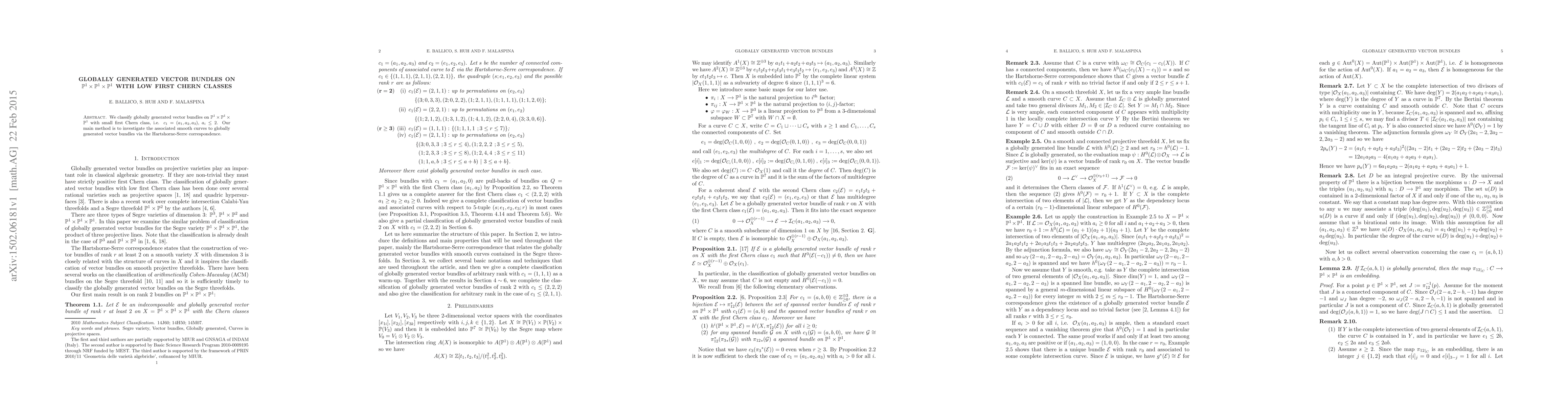 This paper classifies globally generated vector bundles on $\mathbf{P}^1 \times \mathbf{P}^1 \times \mathbf{P}^1$ with first Chern classes $a_i \le 2$ by analyzing associated smooth curves through the Hartshorne-Serre correspondence. The study provides a comprehensive classification of these bundles based on their low first Chern classes.
