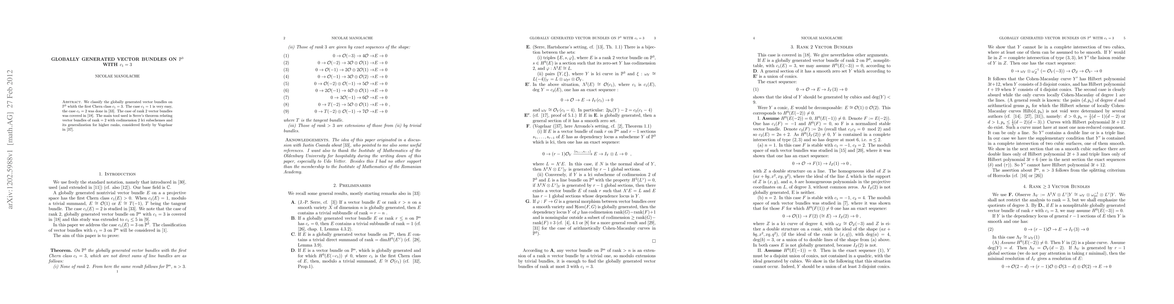 One classifies the globally generated vector bundles on P^3 with the first Chern class c_1=3. The case c_1=2 on P^n was done by J.C. Sierra and L. Ugaglia (see the References) and the case c_1=3, rank=2 on P^n was done by S. Huh (see the References).