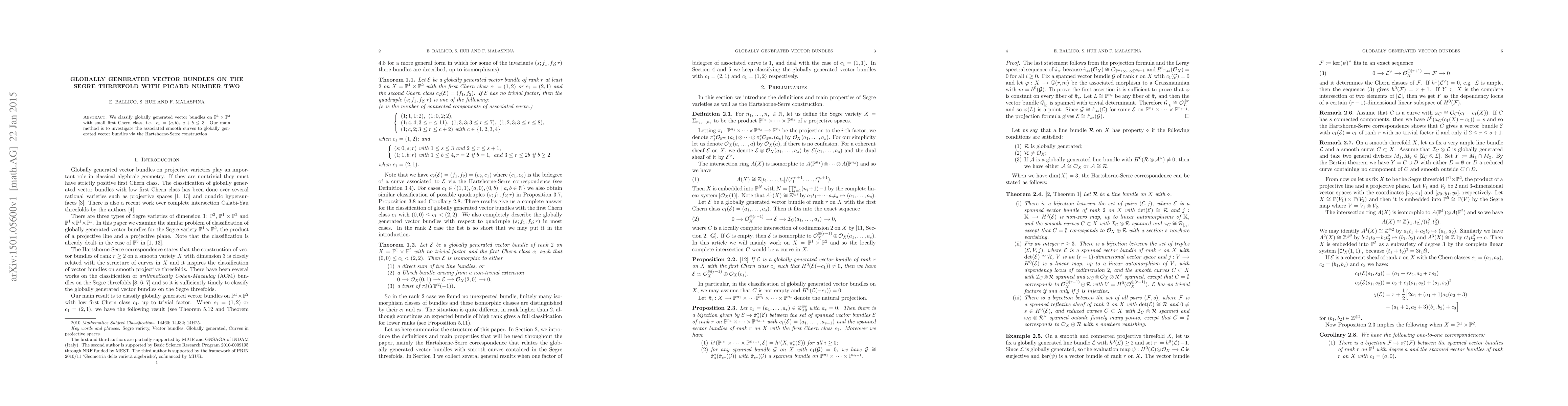This paper classifies globally generated vector bundles on the Segre threefold $\mathbb{P}^1 \times \mathbb{P}^2$ with first Chern class $c_1=(a,b)$ where $a+b \leq 3$. The authors utilize the Hartshorne-Serre construction to study associated smooth curves for this classification.