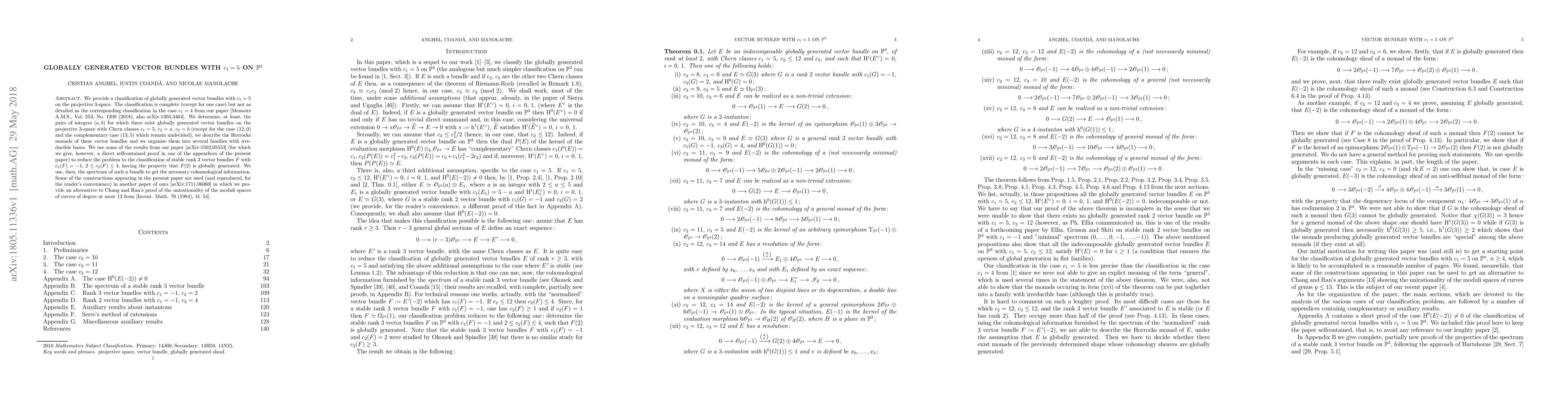 This paper classifies globally generated vector bundles on projective 3-space with first Chern class $c_1 = 5$, determining pairs $(a, b)$ for their second and third Chern classes. It organizes these bundles into families and uses Horrocks monads, though some cases remain undecided.