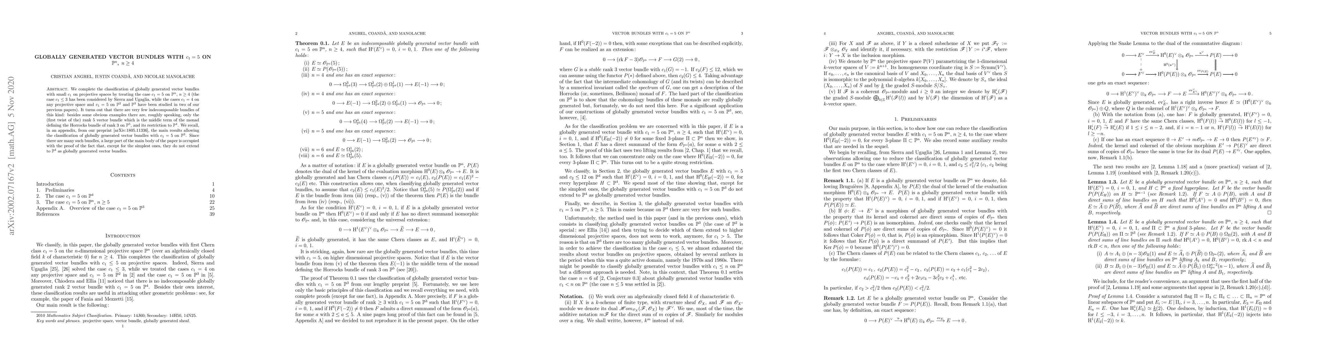 This paper completes the classification of globally generated vector bundles with first Chern class $c_1 = 5$ on projective spaces $\mathbb{P}^n$ for $n \geq 4$. It identifies that only a few indecomposable bundles exist, mainly the first twist of the rank 5 vector bundle from the Horrocks bundle on $\mathbb{P}^5$ and its restriction to $\mathbb{P}^4$.