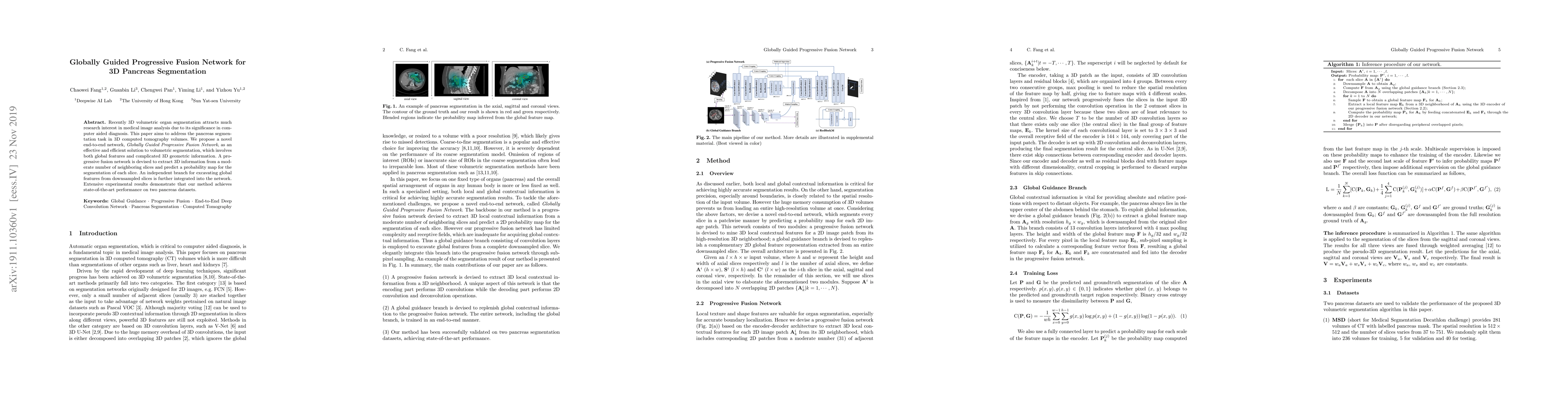 This paper proposes a Globally Guided Progressive Fusion Network for 3D pancreas segmentation in CT volumes, combining global features and 3D geometric information for effective segmentation. The method achieves state-of-the-art performance on two pancreas datasets.
