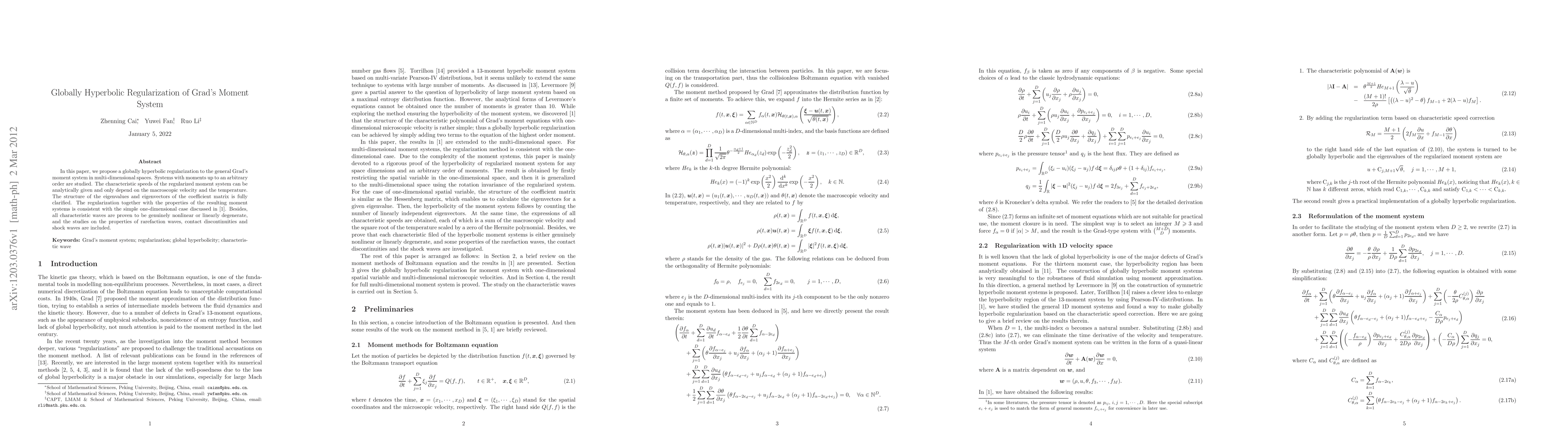 This paper proposes a globally hyperbolic regularization for Grad's moment system in multi-dimensional spaces, ensuring analytically determined characteristic speeds dependent on macroscopic velocity and temperature. The study clarifies the structure of eigenvalues and eigenvectors, proving all characteristic waves to be genuinely nonlinear or linearly degenerate, and includes analyses on rarefaction waves, contact discontinuities, and shock waves.
