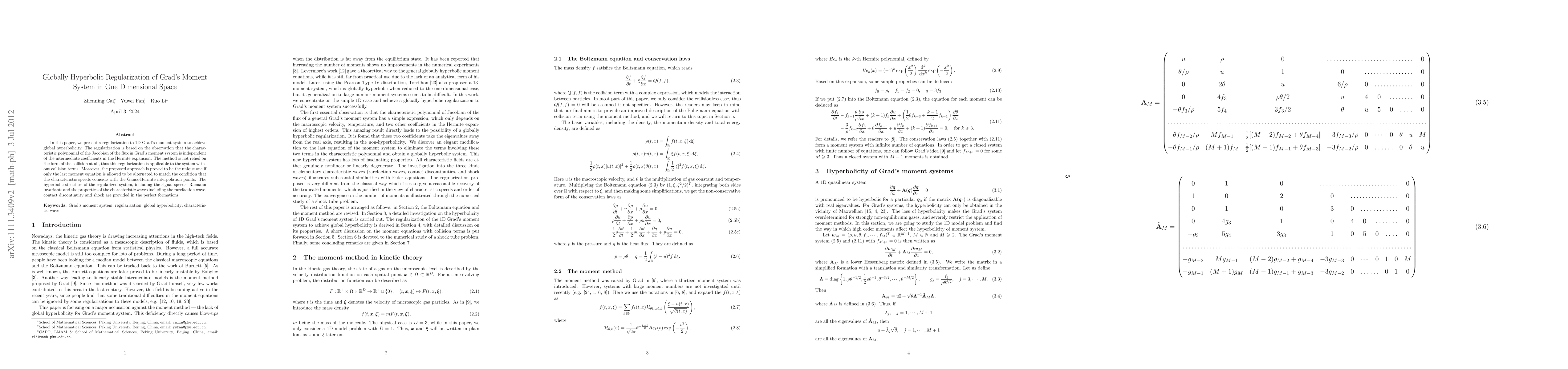 This paper proposes a regularization method for 1D Grad's moment system to achieve global hyperbolicity, independent of collision terms. The method uniquely modifies the last moment equation to match non-equilibrium independent characteristic speeds, ensuring a hyperbolic structure with defined signal speeds, Riemann invariants, and characteristic wave properties.