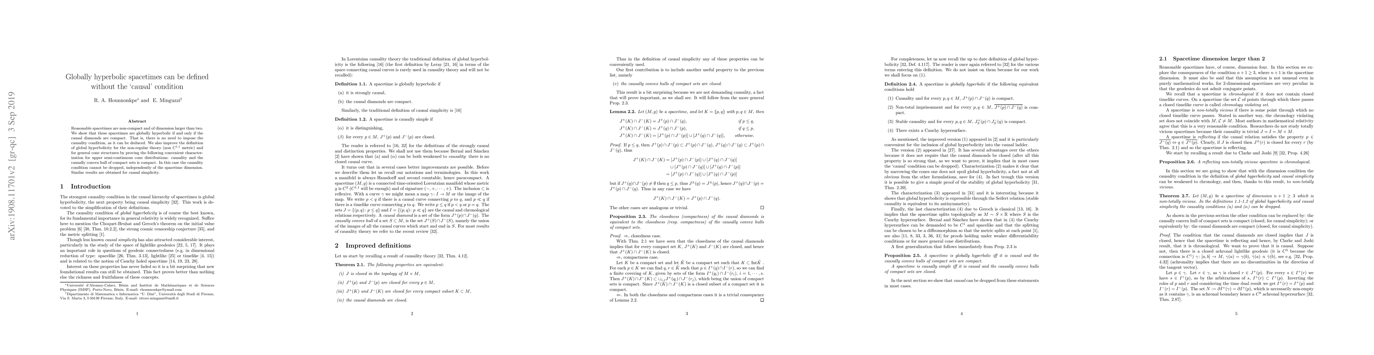 This paper demonstrates that globally hyperbolic spacetimes can be defined purely by the compactness of causal diamonds, eliminating the need for an explicit causality condition. It also refines the definition of global hyperbolicity for non-regular theories and general cone structures, showing that causality remains essential.
