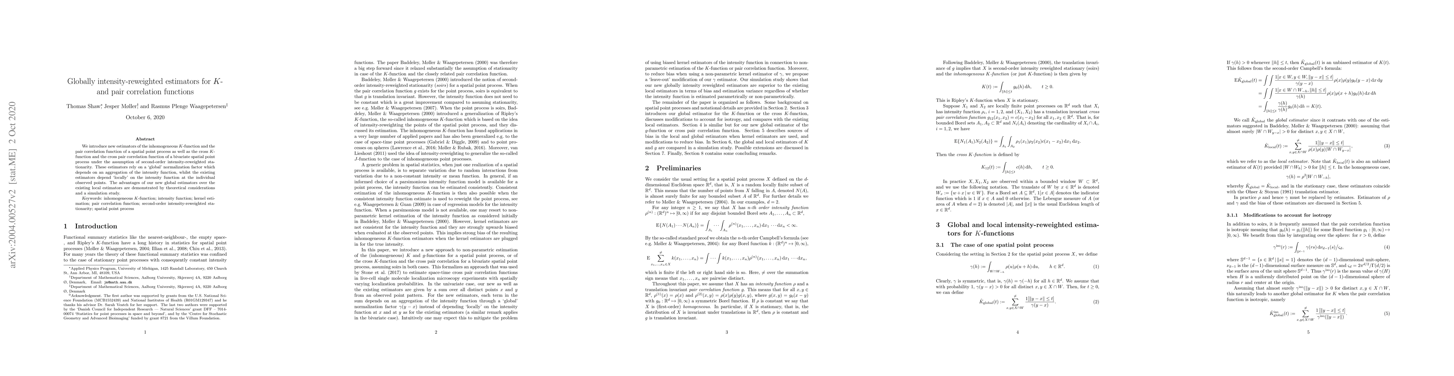 This paper introduces new global intensity-reweighted estimators for $K$-functions and pair correlation functions of spatial point processes, contrasting them with existing local estimators. The global approach aggregates the intensity function, offering advantages demonstrated through theoretical analysis and simulations.