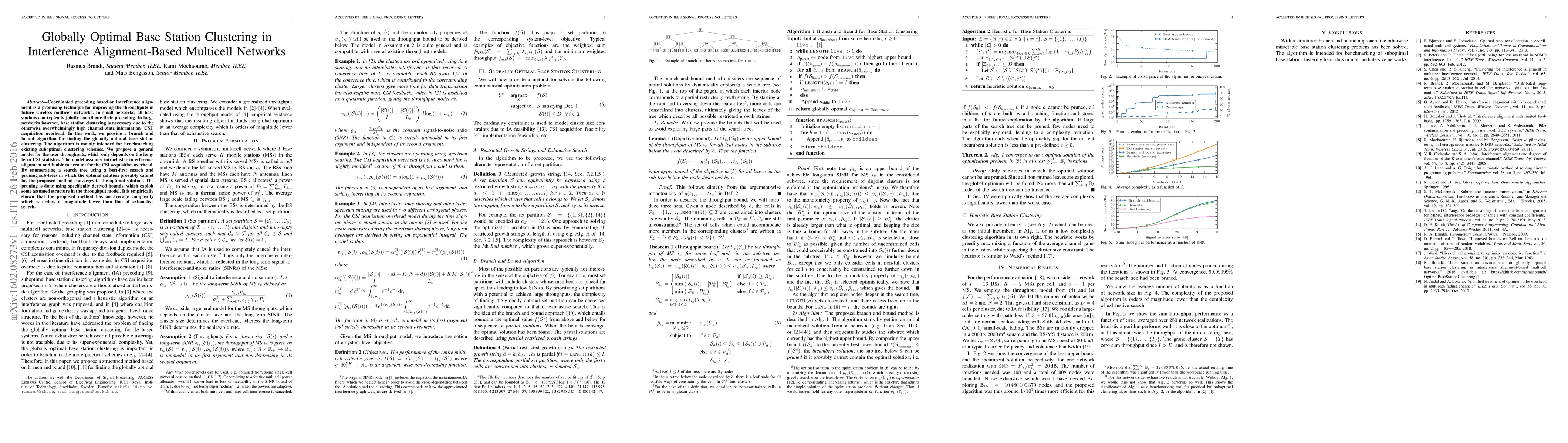 This paper presents a branch and bound algorithm for finding the globally optimal base station clustering in large multicell networks using interference alignment. The method significantly reduces complexity compared to exhaustive search, providing a benchmark for existing suboptimal clustering schemes.