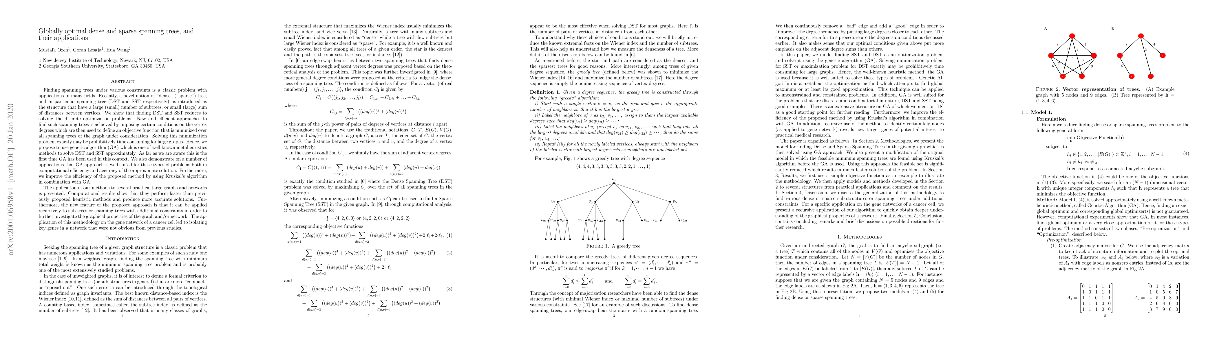 This paper introduces novel methods for finding dense and sparse spanning trees (DST and SST) by solving discrete optimization problems. The authors propose using a genetic algorithm (GA) to efficiently approximate these trees, demonstrating improved computational efficiency and accuracy over previous heuristics. The approach is applied to various large networks, including a cancer cell gene network, revealing key genes not previously identified.