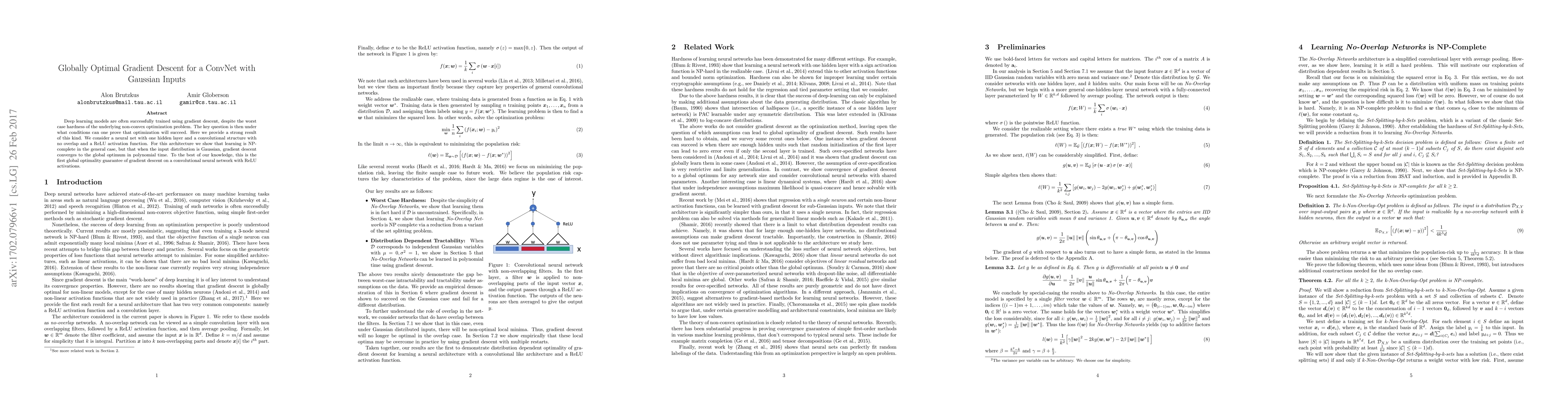 Deep learning models are often successfully trained using gradient descent, despite the worst case hardness of the underlying non-convex optimization problem. The key question is then under what conditions can one prove that optimization will succeed. Here we provide a strong result of this kind. We consider a neural net with one hidden layer and a convolutional structure with no overlap and a ReLU activation function. For this architecture we show that learning is NP-complete in the general case, but that when the input distribution is Gaussian, gradient descent converges to the global optimum in polynomial time. To the best of our knowledge, this is the first global optimality guarantee of gradient descent on a convolutional neural network with ReLU activations.