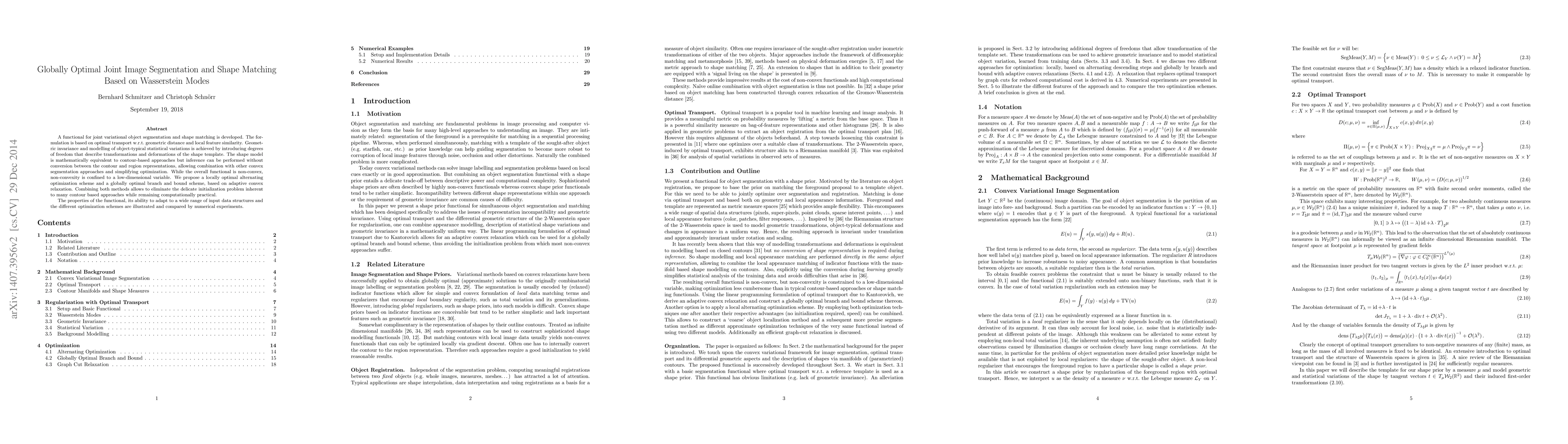This paper develops a joint variational method for image segmentation and shape matching based on Wasserstein modes, utilizing optimal transport for geometric distance and feature similarity. The proposed method combines contour-based and region-based approaches, offering a globally optimal solution through adaptive convex relaxation and a locally optimal alternating optimization scheme.