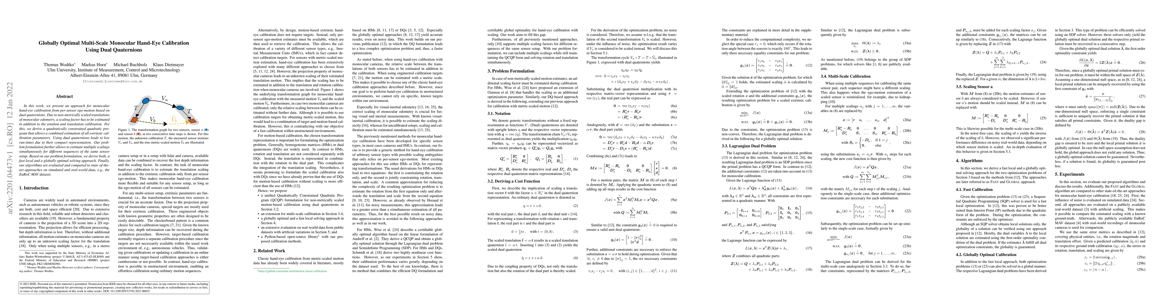 This paper proposes a globally optimal method for multi-scale monocular hand-eye calibration using dual quaternions, addressing the challenge of non-metrically scaled translations by incorporating a scaling factor. It formulates a quadratically constrained quadratic program for efficient estimation of extrinsic calibration parameters.