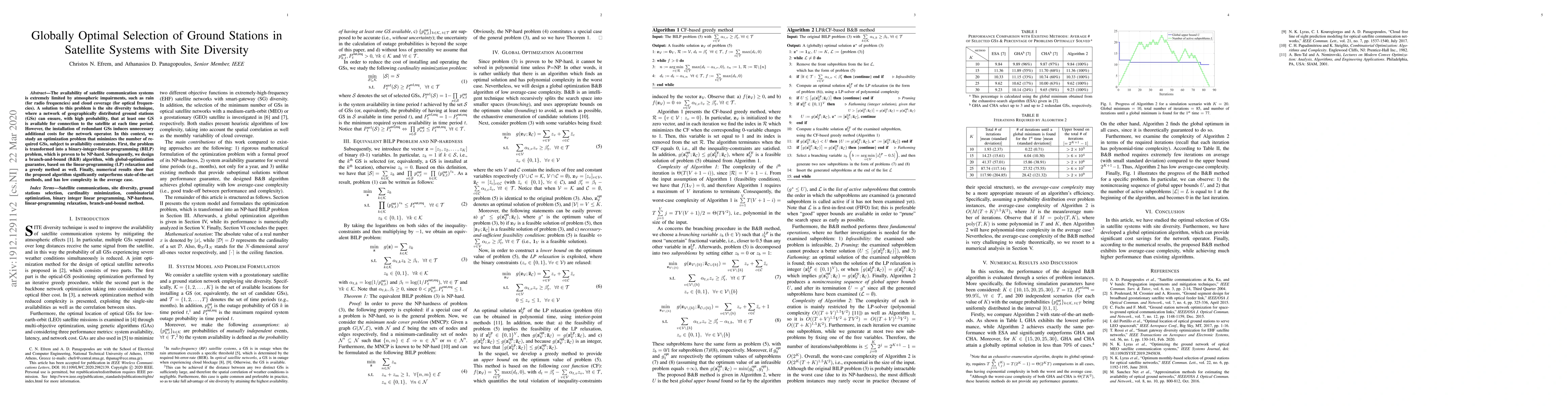 The availability of satellite communication systems is extremely limited by atmospheric impairments, such as rain (for radio frequencies) and cloud coverage (for optical frequencies). A solution to this problem is the site diversity technique, where a network of geographically distributed ground stations (GSs) can ensure, with high probability, that at least one GS is available for connection to the satellite at each time period. However, the installation of redundant GSs induces unnecessary additional costs for the network operator. In this context, we study an optimization problem that minimizes the number of required GSs, subject to availability constraints. First, the problem is transformed into a binary-integer-linear-programming (BILP) problem, which is proven to be NP-hard. Subsequently, we design a branch-and-bound (B&B) algorithm, with global-optimization guarantee, based on the linear-programming (LP) relaxation and a greedy method as well. Finally, numerical results show that the proposed algorithm significantly outperforms state-of-the-art methods, and has low complexity in the average case.