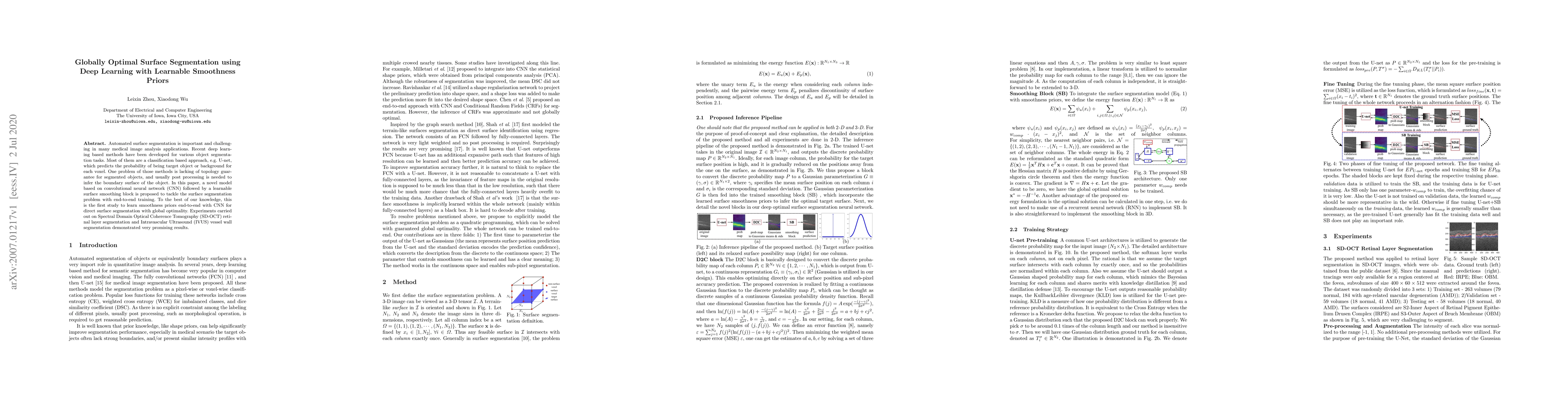 A new deep learning model with a learnable surface smoothing block was developed to tackle surface segmentation with global optimality, achieving promising results in retinal layer and vessel wall segmentation tasks.