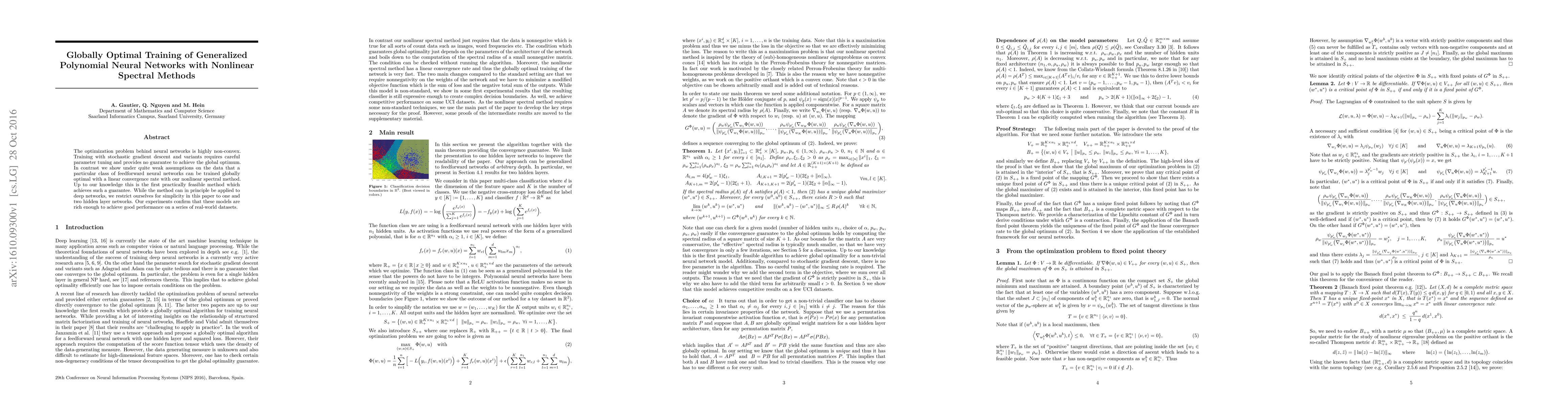 The optimization problem behind neural networks is highly non-convex. Training with stochastic gradient descent and variants requires careful parameter tuning and provides no guarantee to achieve the global optimum. In contrast we show under quite weak assumptions on the data that a particular class of feedforward neural networks can be trained globally optimal with a linear convergence rate with our nonlinear spectral method. Up to our knowledge this is the first practically feasible method which achieves such a guarantee. While the method can in principle be applied to deep networks, we restrict ourselves for simplicity in this paper to one and two hidden layer networks. Our experiments confirm that these models are rich enough to achieve good performance on a series of real-world datasets.