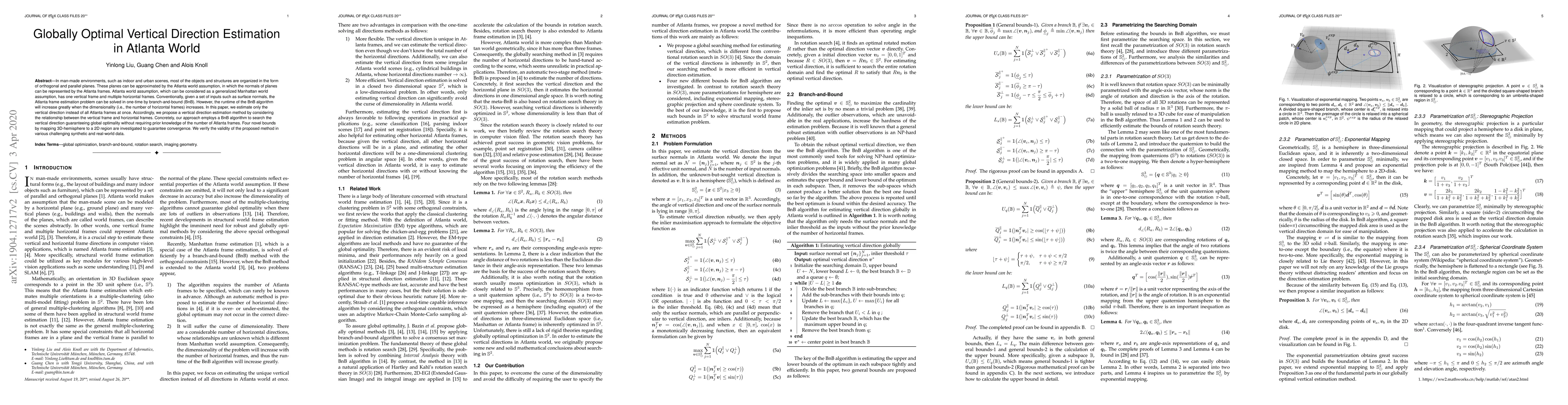 In man-made environments, such as indoor and urban scenes, most of the objects and structures are organized in the form of orthogonal and parallel planes. These planes can be approximated by the Atlanta world assumption, in which the normals of planes can be represented by the Atlanta frames. Atlanta world assumption, which can be considered as a generalized Manhattan world assumption, has one vertical frame and multiple horizontal frames. Conventionally, given a set of inputs such as surface normals, the Atlanta frame estimation problem can be solved in one-time by branch-and-bound (BnB). However, the runtime of the BnB algorithm will increase greatly when the dimensionality (i.e., the number of horizontal frames) increases. In this paper, we estimate only the vertical direction instead of all Atlanta frames at once. Accordingly, we propose a vertical direction estimation method by considering the relationship between the vertical frame and horizontal frames. Concretely, our approach employs a BnB algorithm to search the vertical direction guaranteeing global optimality without requiring prior knowledge of the number of Atlanta frames. Four novel bounds by mapping 3D-hemisphere to a 2D region are investigated to guarantee convergence. We verify the validity of the proposed method in various challenging synthetic and real-world data.