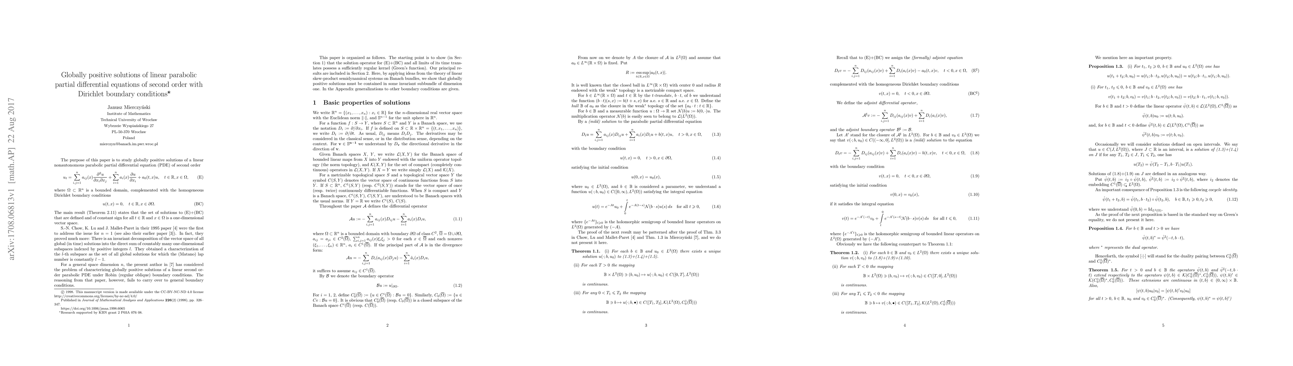 Summary: The paper demonstrates the uniqueness of globally positive solutions to a linear second-order parabolic partial differential equation with Dirichlet boundary conditions, up to multiplication by a positive constant. This result highlights the distinctiveness of such solutions within the specified domain.