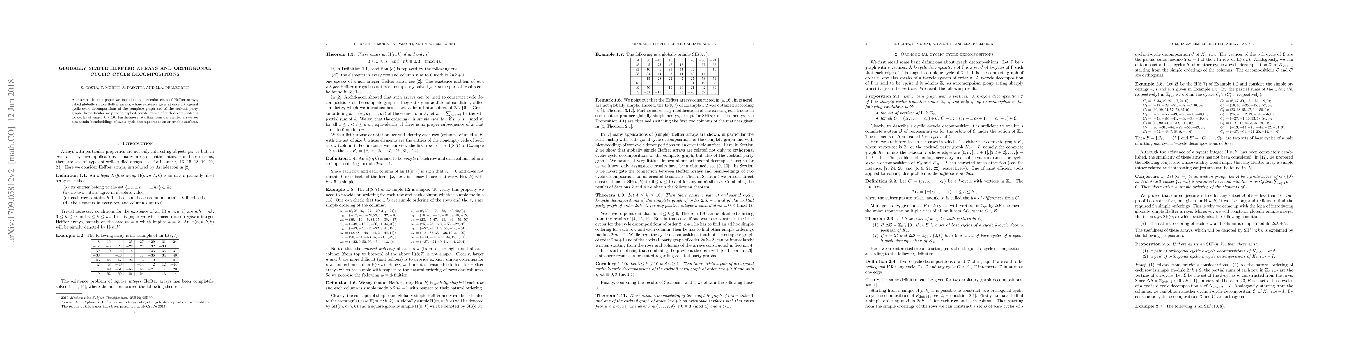 This paper introduces globally simple Heffter arrays, which yield orthogonal cyclic cycle decompositions of complete and cocktail party graphs, with explicit constructions for cycles up to length 10. It also derives biembeddings of these decompositions on orientable surfaces.