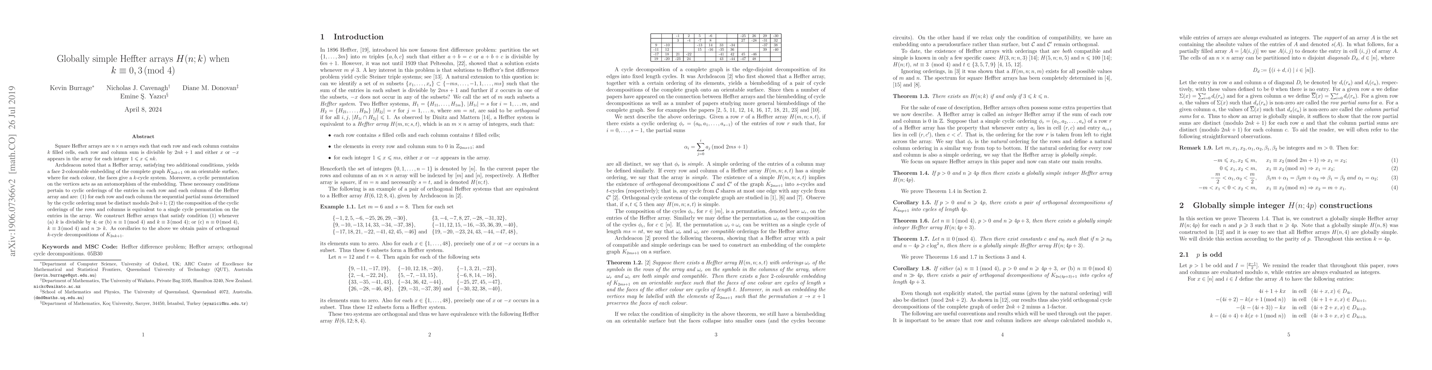 This paper constructs globally simple Heffter arrays $H(n;k)$ for specific cases where $k\equiv 0,3\mod 4$, satisfying conditions that yield face $2$-colourable embeddings of complete graphs on orientable surfaces. The constructions cover scenarios where $k$ is divisible by 4, or $n$ is congruent to 1 or 0 modulo 4 with specific $k$ conditions.