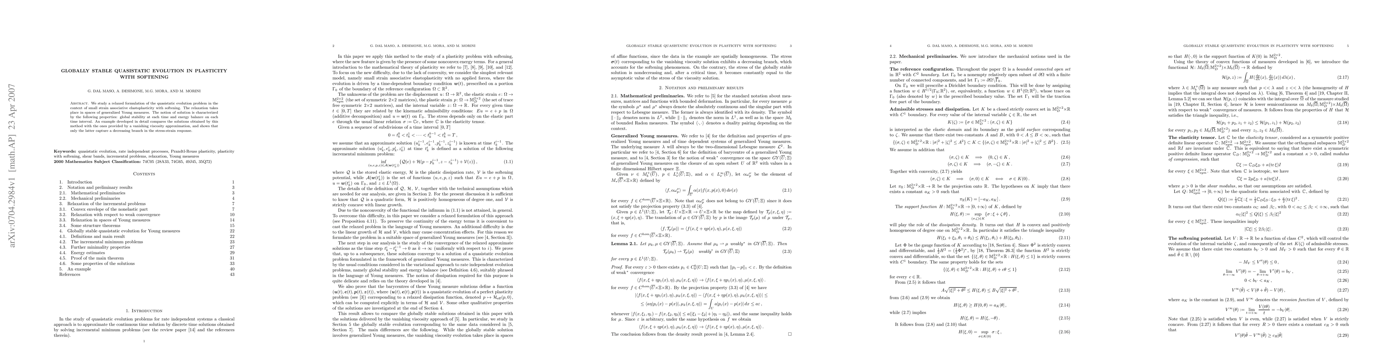 This paper explores a relaxed quasistatic evolution model for small strain associative elastoplasticity with softening, characterized by global stability and energy balance. It demonstrates that only a vanishing viscosity approximation captures the decreasing branch in the stress-strain response, contrasting with the proposed relaxation method.