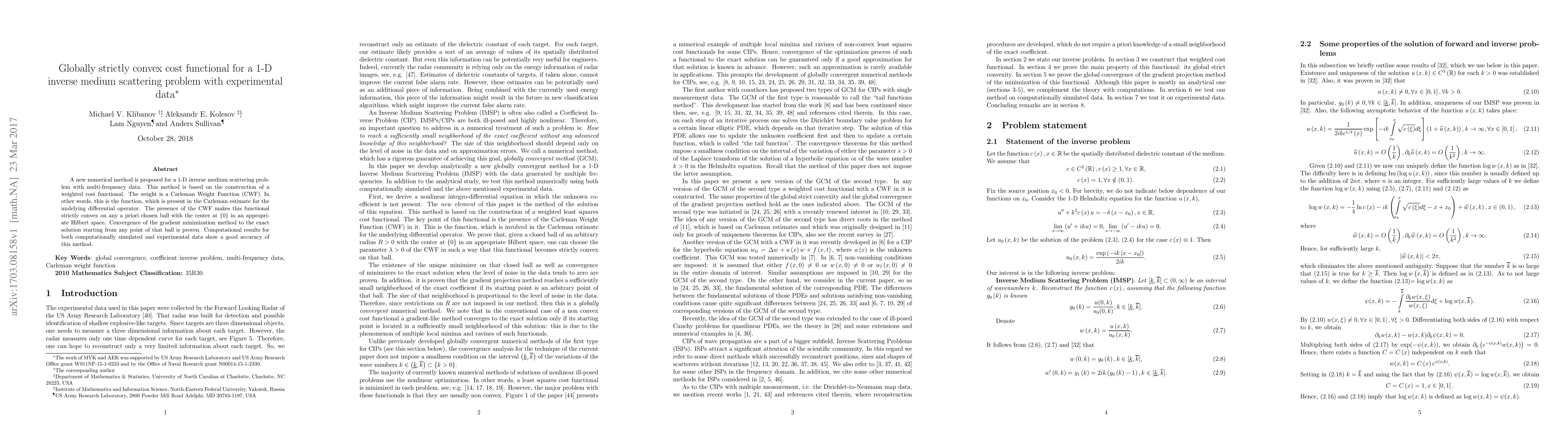 This paper proposes a new numerical method for solving a 1-D inverse medium scattering problem using multi-frequency data. The method constructs a globally strictly convex cost functional with a Carleman Weight Function, ensuring convergence of gradient minimization to the exact solution. Computational results demonstrate high accuracy for both simulated and experimental data.