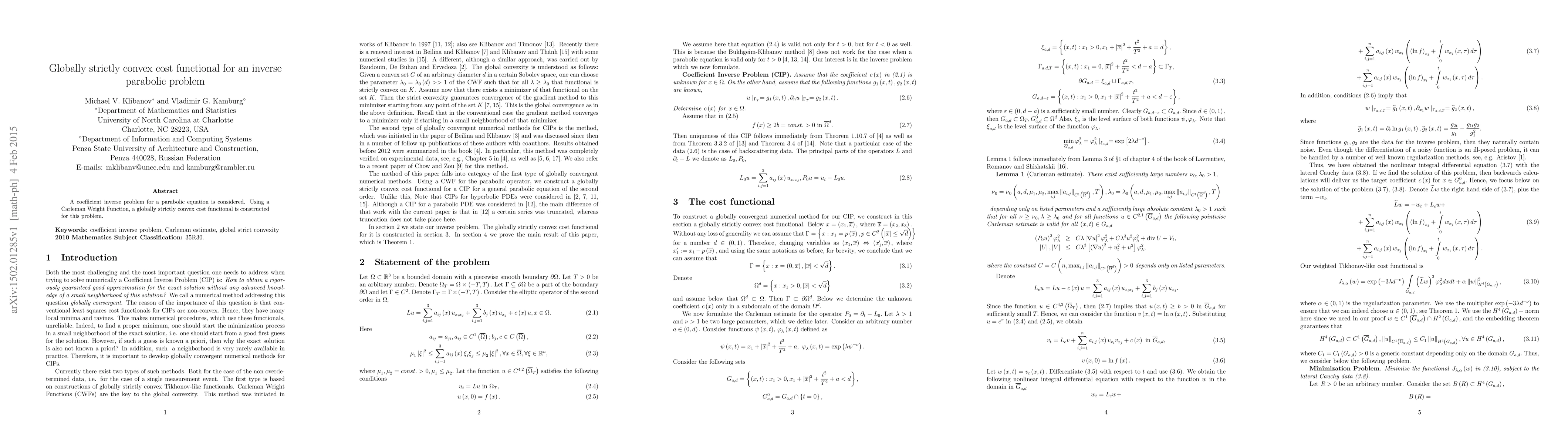 Summary: This paper constructs a globally strictly convex cost functional for solving a coefficient inverse problem in parabolic equations, utilizing a Carleman Weight Function to ensure the solution's uniqueness and stability.